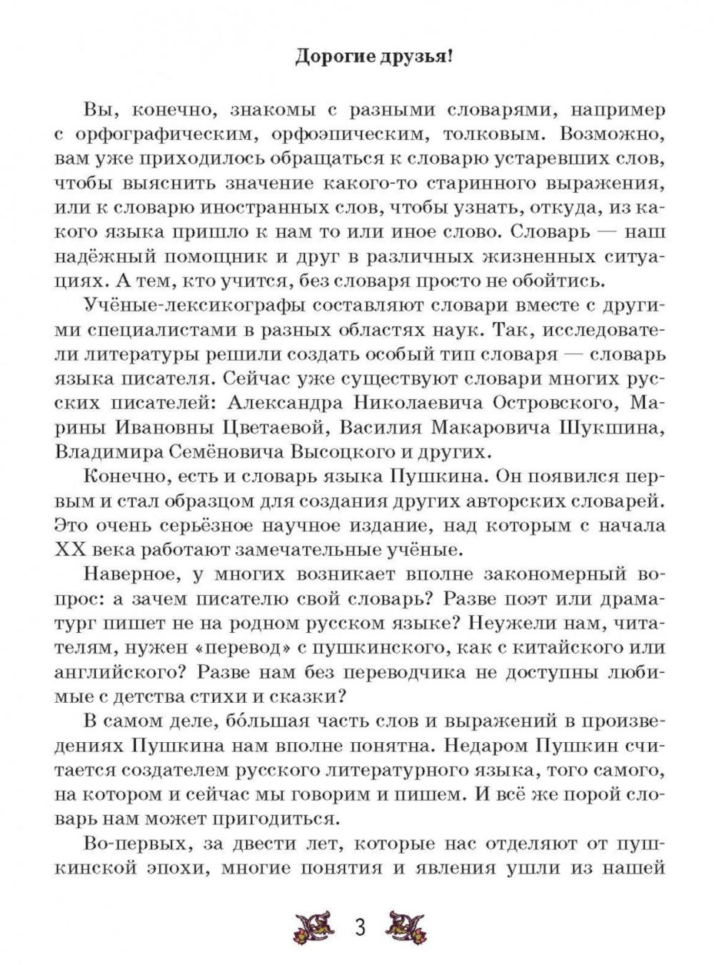 «На языке, тебе невнятном, / Стихи прощальные пишу». Так некогда Пушкин обращался к очаровательной иностранке. Прошло двести лет, и, увы - сегодня эти слова поэт мог бы адресовать своим юным соотечественникам. Простой и ясный пушкинский язык всё-таки содержит немало иносказаний, мифологических имён и прочих «поэтизмов», рассчитанных на читателя с большим культурным запасом. За два с лишним века многие слова вышли из обращения или приобрели иное значение. Сам предметный мир вокруг нас стал совсем иным. Вот почему без пояснений и комментариев многим школьникам сегодня трудно расслышать речь великого поэта. Словарь-справочник поможет сделать «невнятное» - понятным, чтобы слово Пушкина в полной мере открылось юному читателю, достигло и слуха, и сердца. Иллюстрированный словарь-справочник поможет учащимся при чтении произведений поэта, включённых в школьную программу, и даст ёмкую и необходимую информацию в трудных случаях: - прокомментирует историзмы (например, «стряпчий», «камердинер», «исправник» и др.); - объяснит архаизмы (например, «чело», «ланиты», «персты» и др.); - обратит внимание на самые коварные слова в языке поэта - те, значение которых нам кажется вполне ясным (например, рогатка); - пояснит, какое именно значение многозначного слова использует Пушкин в конкретном фрагменте; - научит различать «одинаковые» слова с разными значениями (омонимы); - в рубрике «Комментарии составителей» объяснит, почему Пушкин использует то или иное слово, выражение, какой оттенок смысла они вносят в целое произведение; - в «Исторических справках» более развёрнуто расскажет о некоторых особенностях культуры, быта, нравов пушкинской эпохи; - словарь-справочник включает только те слова, которые могут вызвать затруднение у сегодняшнего юного читателя и из тех произведений, которые входят в основную школьную программу по литературе. Описания предметного мира дополнены исторически выверенными иллюстрациями. Словарь-справочник адресован учащимся общеобразовательных школ, учителям, родителям.| Издательство | ИД Вахромеева |