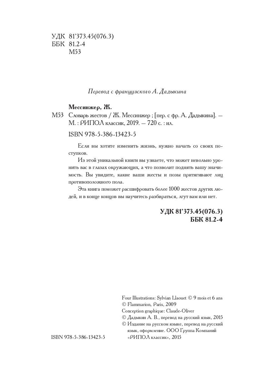 Если вы хотите изменить жизнь, нужно начать со своих поступков. Из этой уникальной книги вы узнаете, что может невольно уронить вас в глазах окружающих, а что позволит поднять вашу значимость. Вы увидите, какие ваши жесты и позы притягивают лиц противоположного пола. Эта книга поможет расшифровать более 1000 жестов других людей, и в конце концов вы научитесь разбираться, лгут вам или нет.| Издательство | Рипол Классик |