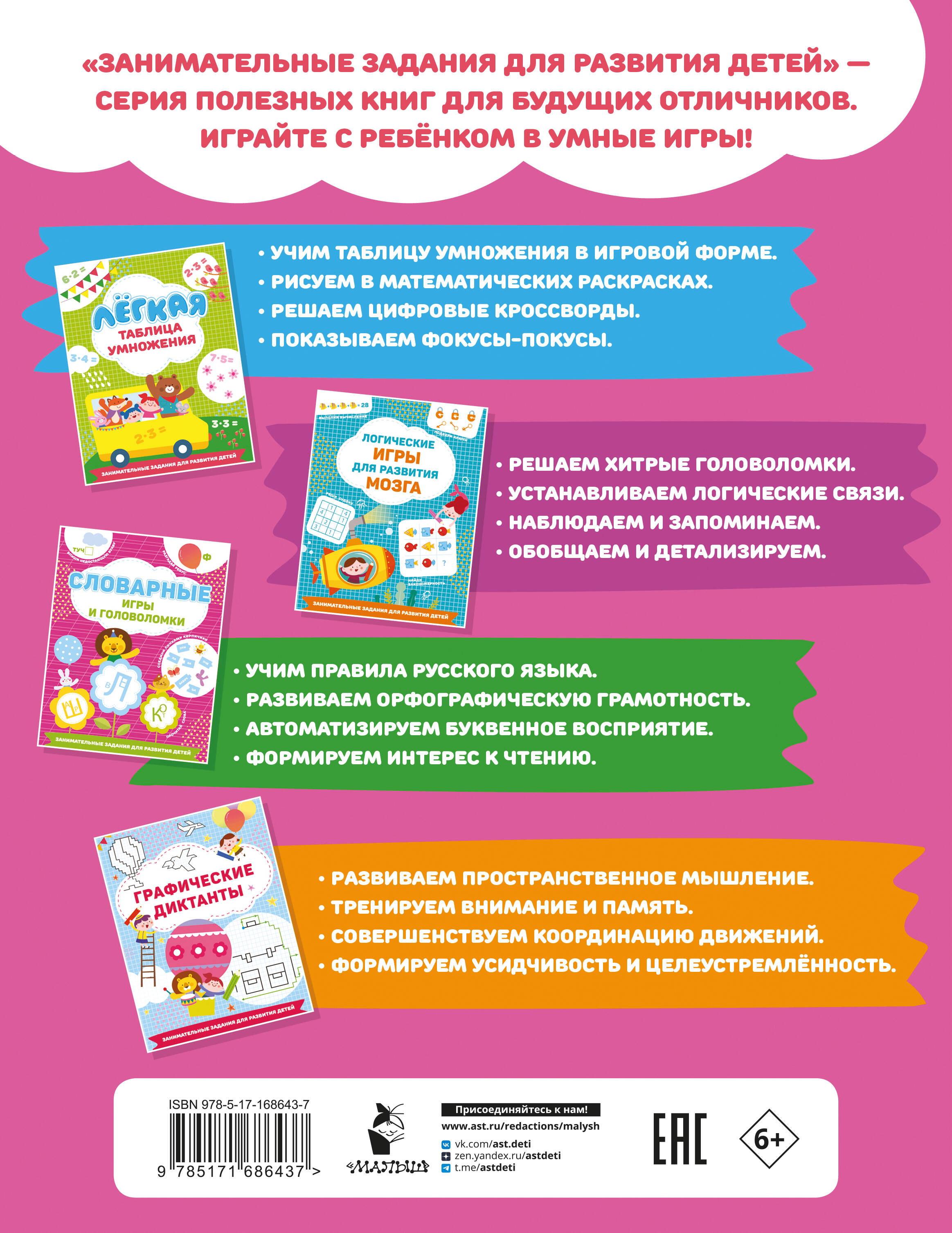 Играйте с ребёнком в умные игры! Благодаря полезному тренажёру «Словарные игры и головоломки» ребёнок улучшит орфографическую грамотность, автоматизирует буквенное восприятие (больше никаких букв вверх ногами и в зеркальном отражении!), научится разгадывать кроссворды и ребусы, различать сходные и противоположные по смыслу слова и многое другое. Сверхзадача - сформировать у ребёнка позитивное восприятие букв и слов, чтобы у него появился интерес к чтению. Чтение книг - это не только способ получения информации. При осмысленном чтении в мозгу образуются новые нейронные связи, что способствует развитию памяти, внимания и воображения, формирует эмпатию и креативность, улучшает социальные навыки.| Издательство | Издательство "АСТ" |