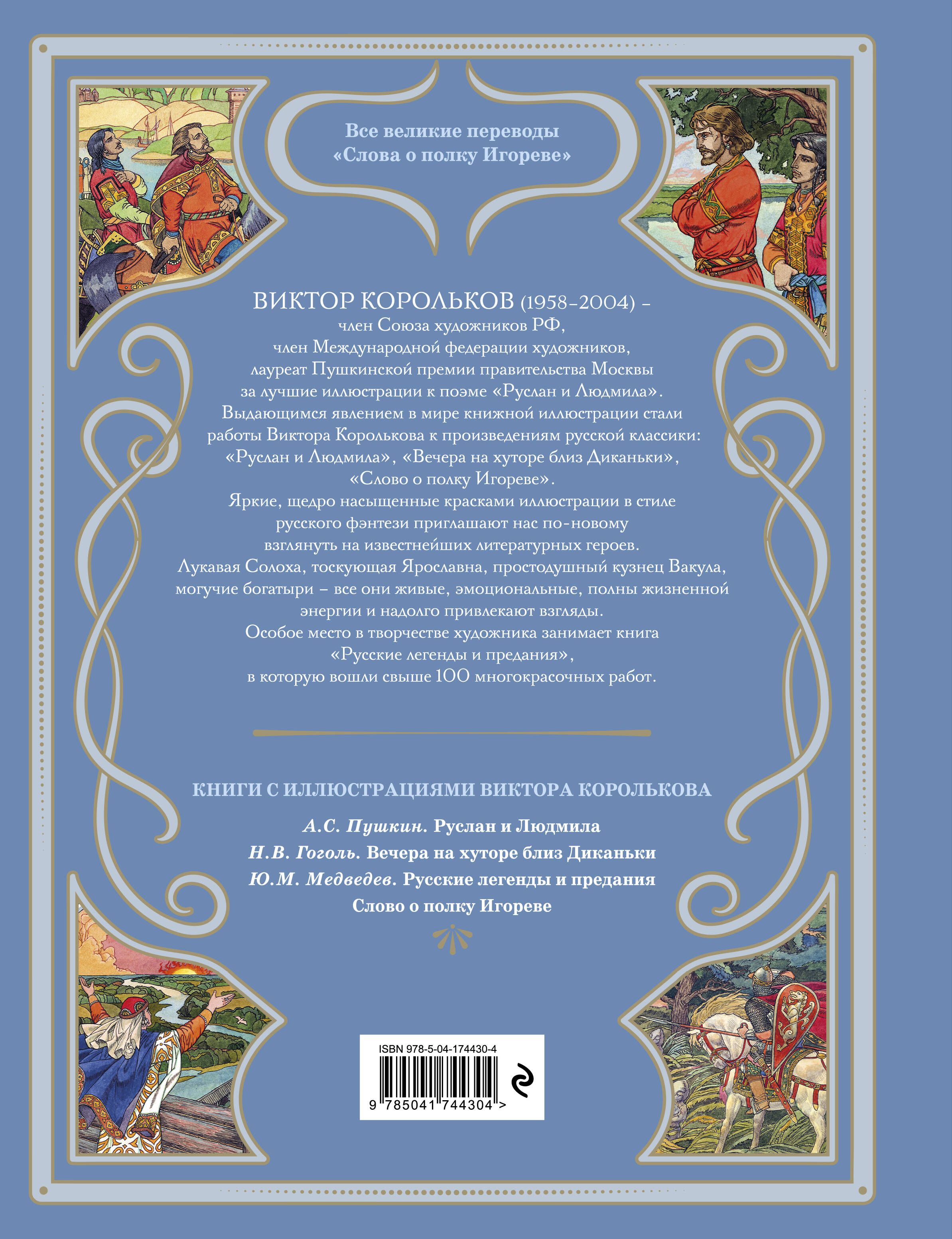 ШЕСТЬ ВЕЛИКИХ ПЕРЕВОДОВ ЗНАМЕНИТОГО ДРЕВНЕРУССКОГО ЭПОСА В ОДНОЙ КНИГЕ! Издание подарочного формата в великолепном полиграфическом исполнении. Твёрдый переплёт с выпуклыми элементами и частичным лаком. Цветные форзацы. Плотная бумага с цветной каймой по краю страницы. Чёткий, крупный, хорошо читаемый шрифт. Выразительные, насыщенные яркими цветами иллюстрации в редком стиле русского фэнтези созданы замечательным русским художником, лауреатом Пушкинской премии Виктором Корольковым. *** «Слово о полку Игореве» - один из самых таинственных старинных текстов. Оригинал рукописи был обнаружен в начале 1790-х годов, а в 1812 году сгорел в пламени московского пожара. Больше столетия учёные ломали копья, пытаясь установить дату написания «Слова о полку Игореве». И только в XX веке удалось доказать, что эпосу не меньше 700 лет. В основу рукописи легли подлинные события конца XII века: разгром русского войска в битве с половцами и пленение новгород-северского князя Игоря. Но с течением времени эпос не утратил своей актуальности. По-прежнему важна и современна его основная идея: Русь, Русская земля, Русское государство сильны только тогда, когда они едины. «Слово о полку Игореве» не раз вдохновляло известнейших писателей. В XIX веке переводы и переложения выносили на суд читающей публики Василий Капнист, Николай Карамзин, Василий Жуковский, Аполлон Майков. Один из лучших поэтических переводов века двадцатого принадлежит Николаю Заболоцкому. Все они, а также один из первых анонимных переводов XVIII века, представлены в этой книге. *** В мини-серию с иллюстрациями Виктора Королькова вошли книги: А. Пушкин «Руслан и Людмила», Н. Гоголь «Вечера на хуторе близ Диканьки», Ю. Медведев «Русские легенды и предания», «Слово о полку Игореве».| Издательство | ООО "Издательство "Эксмо" |