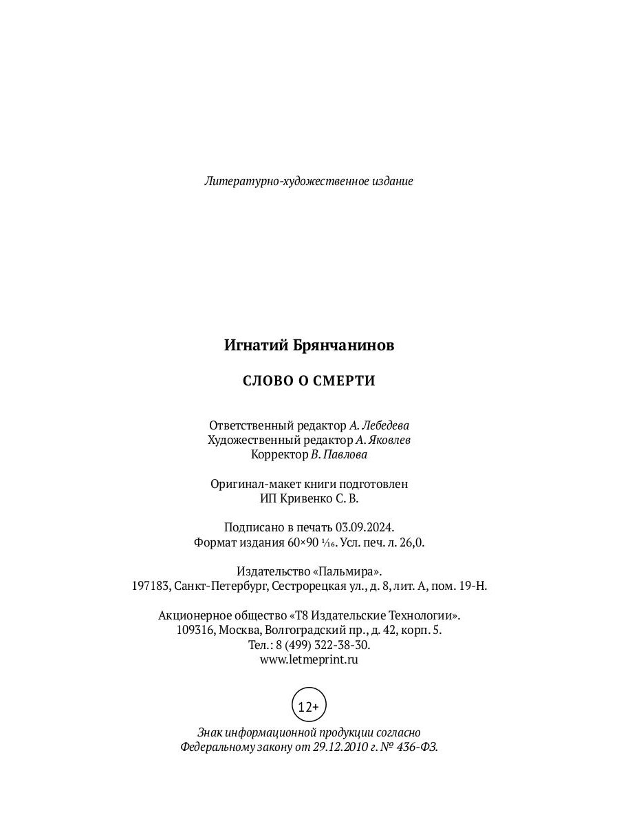 «Слово о смерти» святителя Игнатия (Брянчанинова) посвящено важнейшей теме христианского учения - смерти и загробному бытию. Автор, выдающийся православный богослов и писатель, анализирует страх перед телесной смертью, его корни и способы преодоления через приобщение к истинной духовной жизни. Свои рассуждения писатель подкрепляет многочисленными обращениями к трудам святых отцов и житиям святых, приводя наглядные примеры живого памятования о смерти, выражающегося в молитве, покаянии, исполнении евангельских заповедей и совершении добрых дел. Именно такое, серьезное и вдумчивое отношение к неизбежному окончанию земного пути, по мысли святителя, способно направлять нас на истинный путь - к вечности, в которую, отбросив земное, мы сможем войти с радостью неизреченной. В настоящем издании духовное сочинение святителя Игнатия публикуется в полном объеме и сопровождается комментарием. Дополняют книгу выдержки из трудов другого христианского подвижника, Учителя Церкви, преподобного Ефрема Сирина, поясняющие некоторые принципы христианской эсхатологии.| Издательство | Т8 RUGRAM |