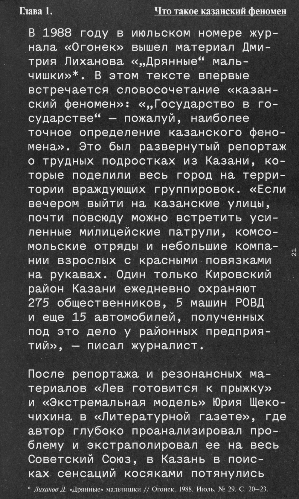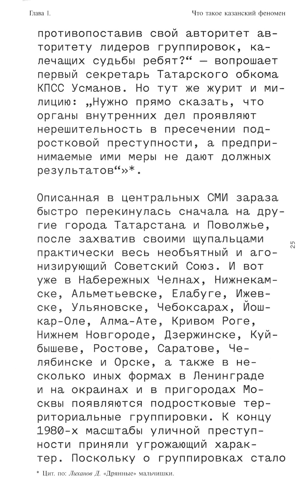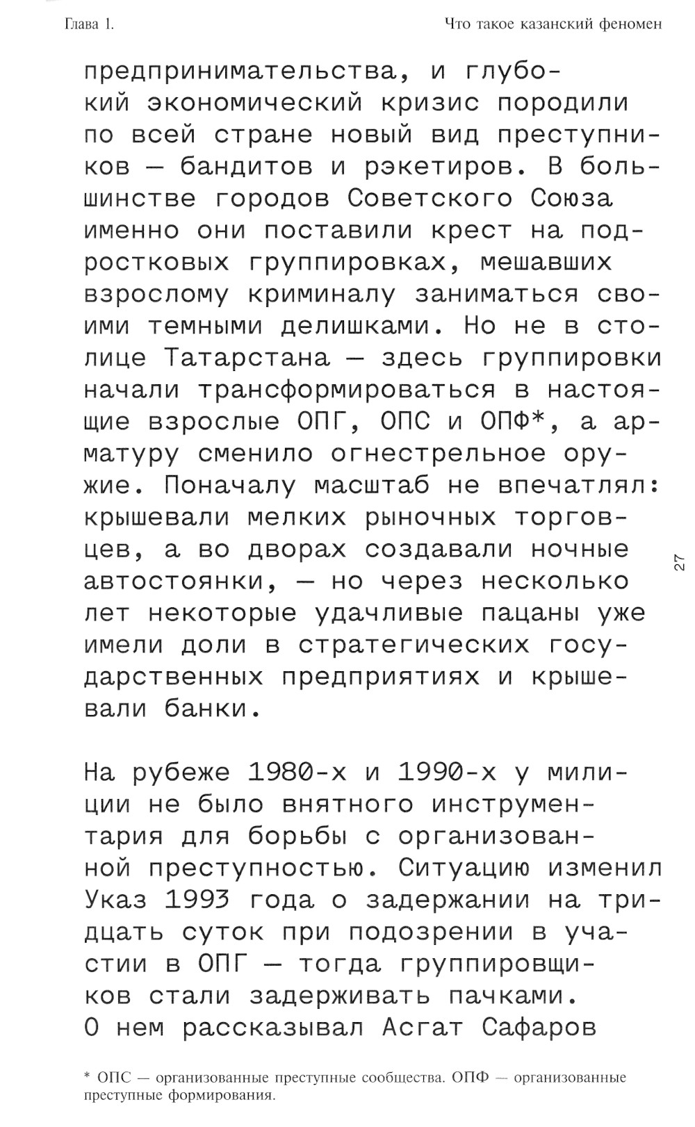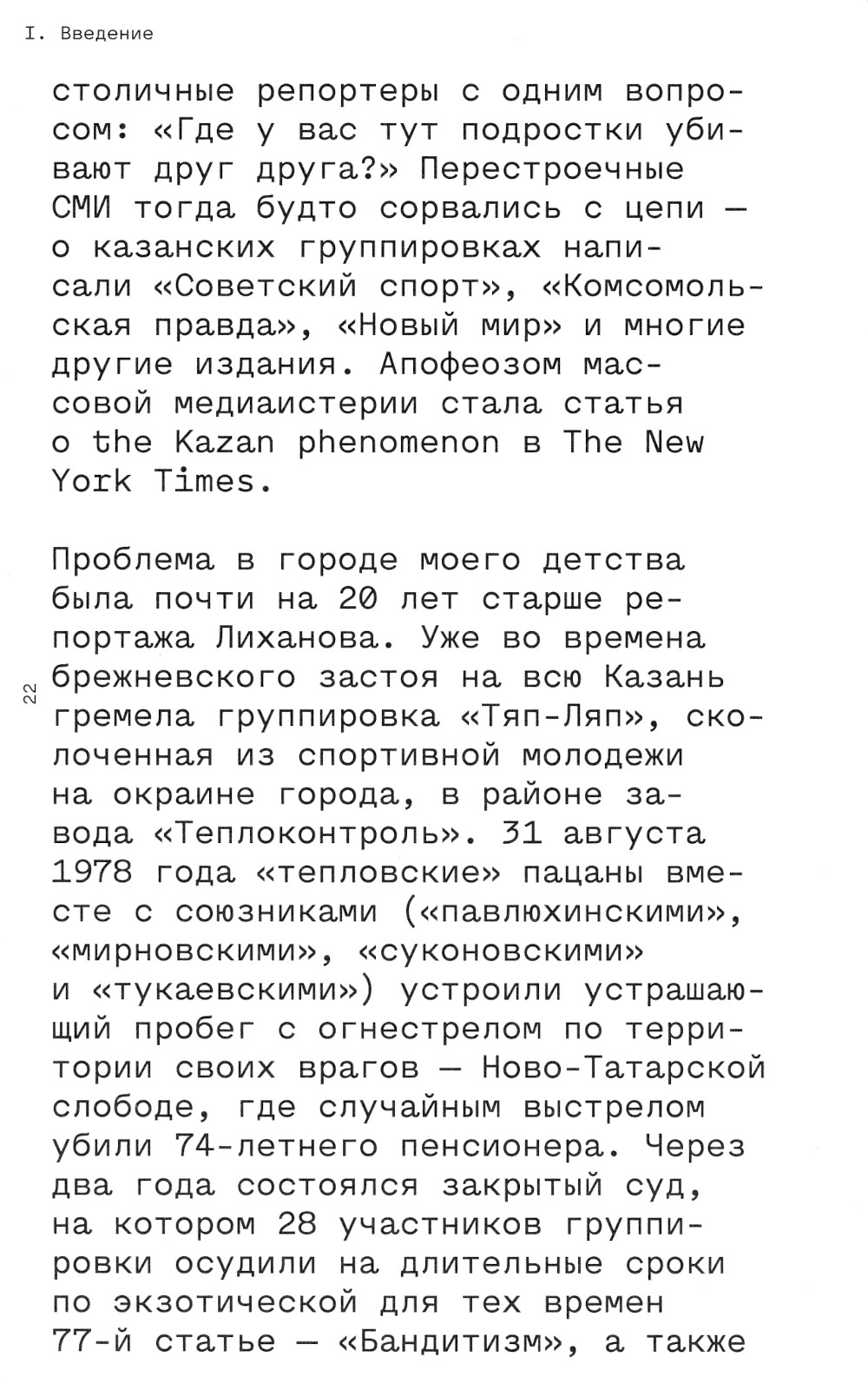 Если вы выросли в России в конце XX века, то в вашей жизни были уличные драки. Эта книга о тех, кто сделал насилие своим кредо: бил и попадал под раздачу - профессионально, ежедневно, беспощадно. Это пацаны, участники бесчисленных молодежных группировок, наводнивших поздний Советский Союз. Первым городом, в котором явление стало по-настоящему массовым, была Казань. Роберт Гараев, автор этой книги, попал в «Низы», одну из местных банд, еще в средней школе. Спустя 30 лет он решил выяснить, откуда взялся казанский феномен - полторы сотни подростковых группировок, что сначала «делили асфальт» в драках район на район, а затем начали массово истреблять себе подобных, - и как вспоминают те суровые дни сами пацаны, бывшие сотрудники милиции, адвокаты и простые жители города, обезображенного страхом и жестокостью. Это единственная книга, целиком составленная из голосов выживших - и желающих рассказать правду.| Издательство | Индивидуум |