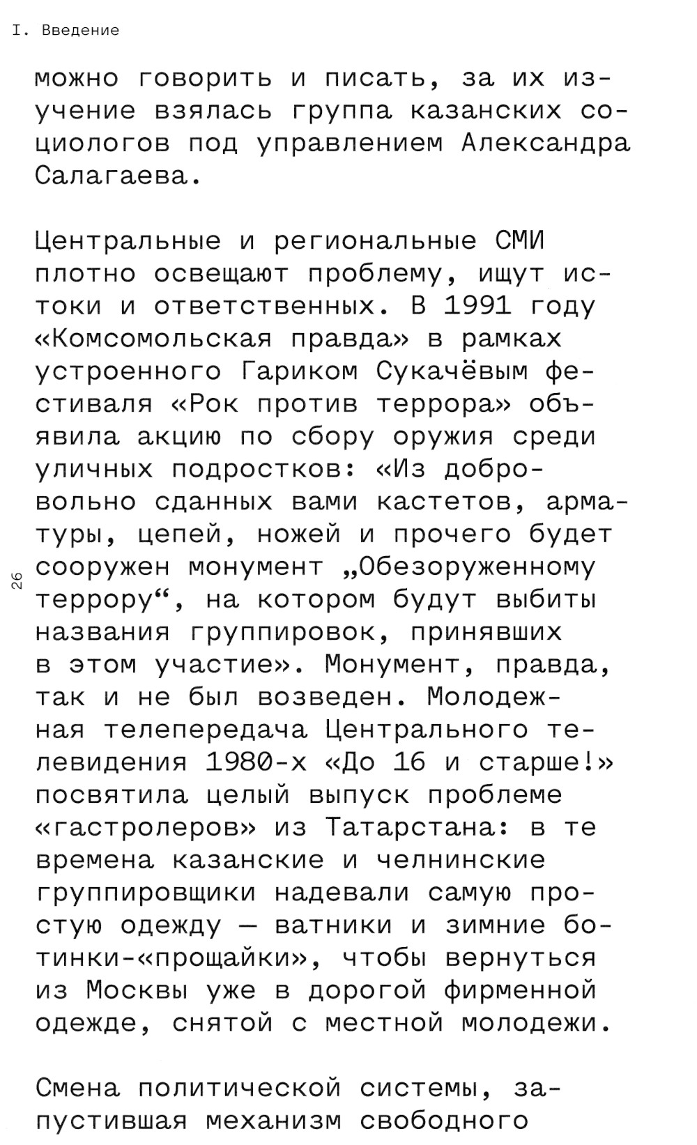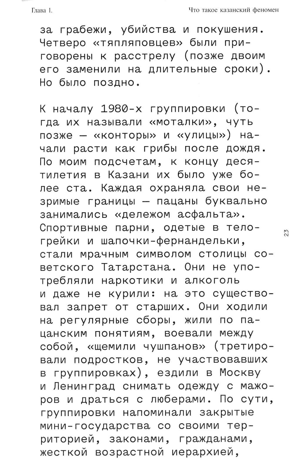 Если вы выросли в России в конце XX века, то в вашей жизни были уличные драки. Эта книга о тех, кто сделал насилие своим кредо: бил и попадал под раздачу - профессионально, ежедневно, беспощадно. Это пацаны, участники бесчисленных молодежных группировок, наводнивших поздний Советский Союз. Первым городом, в котором явление стало по-настоящему массовым, была Казань. Роберт Гараев, автор этой книги, попал в «Низы», одну из местных банд, еще в средней школе. Спустя 30 лет он решил выяснить, откуда взялся казанский феномен - полторы сотни подростковых группировок, что сначала «делили асфальт» в драках район на район, а затем начали массово истреблять себе подобных, - и как вспоминают те суровые дни сами пацаны, бывшие сотрудники милиции, адвокаты и простые жители города, обезображенного страхом и жестокостью. Это единственная книга, целиком составленная из голосов выживших - и желающих рассказать правду.| Издательство | Индивидуум |