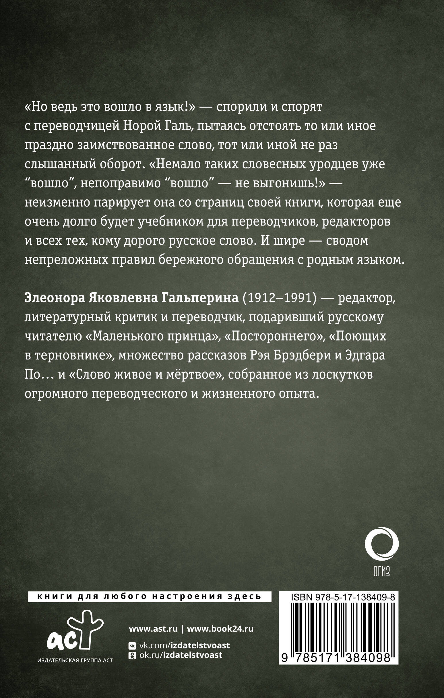 "Но ведь это вошло в язык!" - спорили и спорят с переводчицей Норой Галь, пытаясь отстоять то или иное праздно заимствованное слово, тот или иной не раз слышанный оборот. "Немало таких словесных уродцев уже "вошло", непоправимо "вошло" - не выгонишь!" - неизменно парирует она со страниц своей книги, которая еще очень долго будет учебником для переводчиков, редакторов и всех тех, кому дорого русское слово. И шире - сводом непреложных правил бережного обращения с родным языком. Элеонора Яковлевна Гальперина (1912-1991) - редактор, литературный критик и переводчик, подаривший русскому читателю "Маленького принца", "Постороннего", "Поющих в терновнике", множество рассказов Рэя Брэдбери и Эдгара По… и "Слово живое и мертвое", собранное из лоскутков огромного переводческого и жизненного опыта.| Издательство | ИЗДАТЕЛЬСТВО "АСТ" |