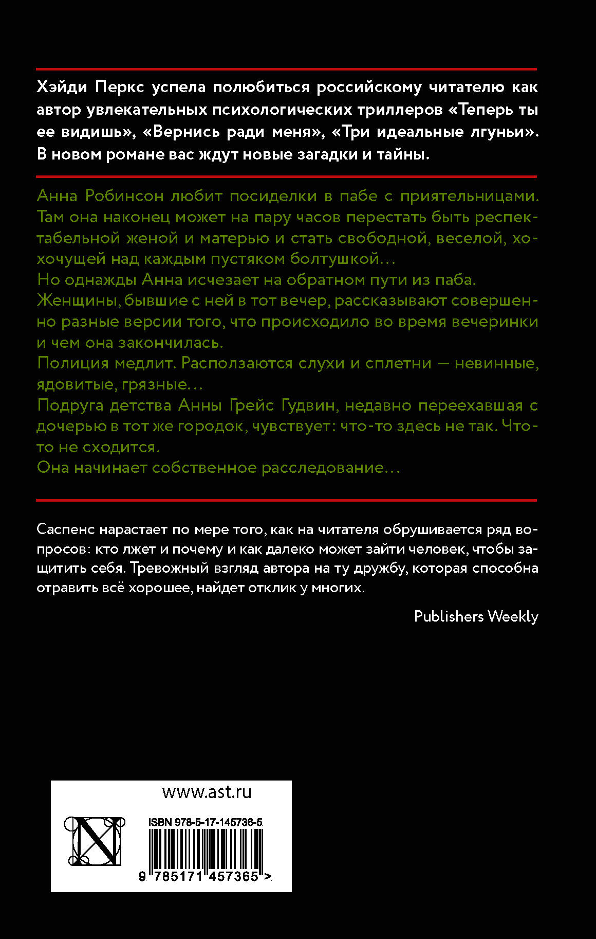 Анна Робинсон любит посиделки в пабе с приятельницами. Там она, наконец, может на пару часов перестать быть респектабельной женой и матерью и стать свободной, веселой, хохочущей над каждым пустяком болтушкой... Но однажды Анна исчезает на обратном пути из паба. Женщины, бывшие с ней в тот вечер, рассказывают совершенно разные версии того, что происходило во время вечеринки и чем она закончилась. Полиция медлит. Расползаются слухи и сплетни - невинные, ядовитые, грязные... Подруга детства Анны Грейс Гудвин, недавно переехавшая с дочерью в тот же городок, чувствует: что-то здесь не так. Что-то не сходится. Она начинает собственное расследование...| Издательство | АСТ |