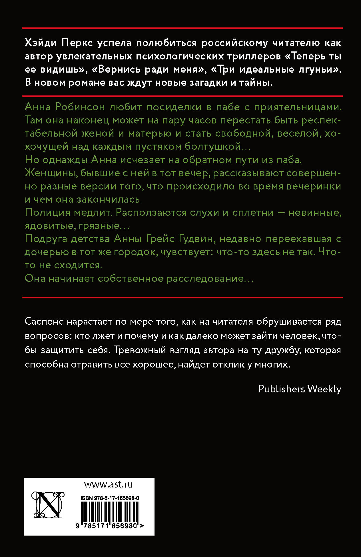Анна Робинсон любит посиделки в пабе с приятельницами. Там она наконец может на пару часов перестать быть респектабельной женой и матерью и стать свободной, веселой, хохочущей над каждым пустяком болтушкой... Но однажды Анна исчезает на обратном пути из паба. Женщины, бывшие с ней в тот вечер, рассказывают совершенно разные версии того, что происходило во время вечеринки и чем она закончилась. Полиция медлит. Расползаются слухи и сплетни - невинные, ядовитые, грязные... Подруга детства Анны Грейс Гудвин, недавно переехавшая с дочерью в тот же городок, чувствует: что-то здесь не так. Что-то не сходится. Она начинает собственное расследование...| Издательство | Издательство "АСТ" |