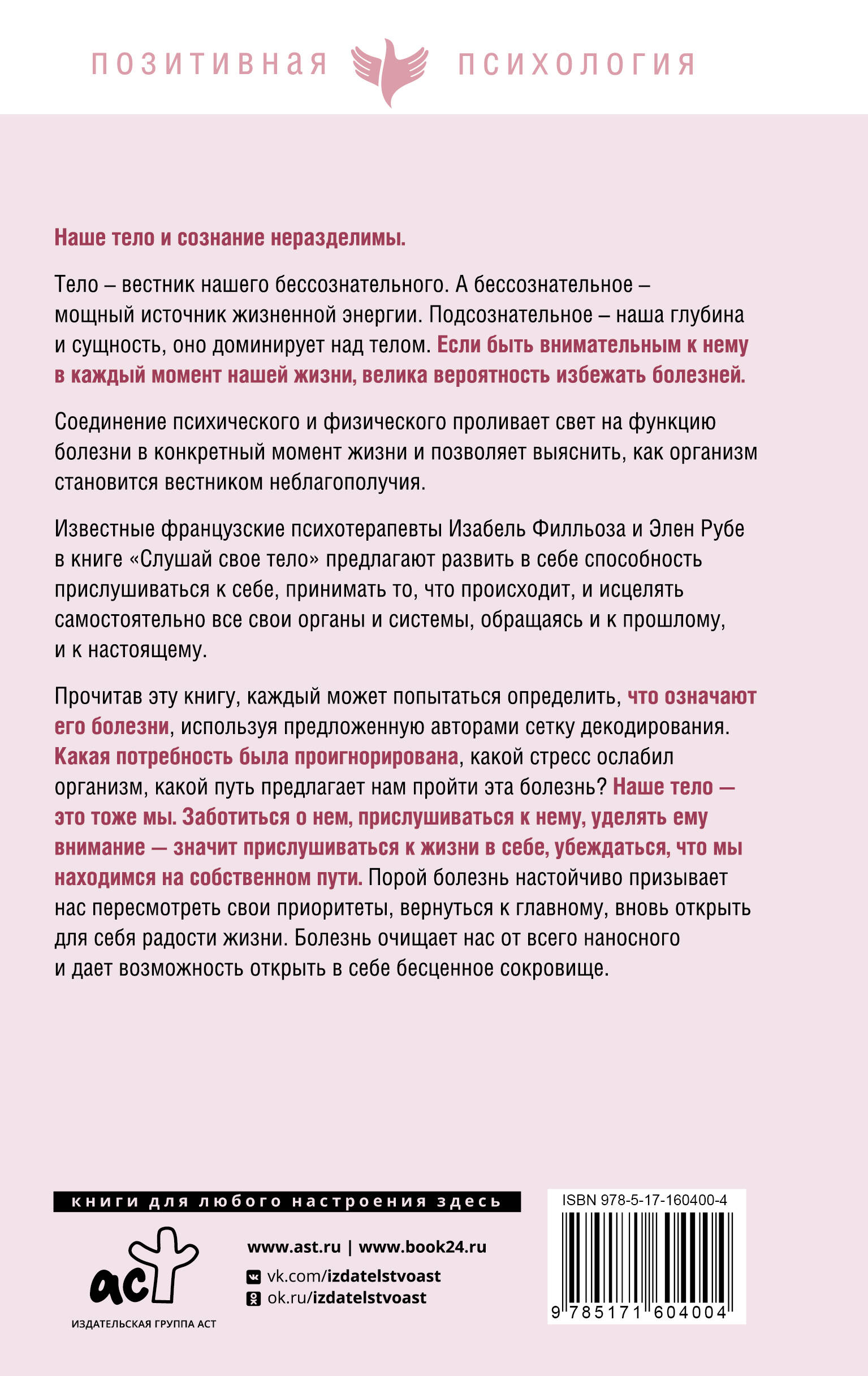 Наше тело и сознание неразделимы. Соединение психического и физического проливает свет на функцию болезни в конкретный момент жизни и позволяет выяснить, как организм становится вестником неблагополучия. Известные французские психотерапевты Изабель Филльоза и Элен Рубе в книге "Слушай свое тело" предлагают развить в себе способность прислушиваться к себе, принимать то, что происходит, и исцелять самостоятельно все свои органы и системы, как обращаясь к прошлому, так и в настоящем. Прочитав эту книгу каждый может попытаться определить, что означают его болезни, используя предложенную авторами сетку декодирования. Какая потребность была проигнорирована, какой стресс ослабил организм, какой путь предлагает нам пройти эта болезнь? Наше тело - это тоже мы. Заботиться о нем, прислушиваться к нему, уделять ему внимание - значит прислушиваться к жизни в себе, убеждаться, что мы находимся на собственном пути. Порой болезнь настойчиво призывает нас пересмотреть свои приоритеты, вернуться к главному, вновь открыть для себя радости жизни. Болезнь очищает нас от всего наносного и дает возможность открыть в себе бесценное сокровище.| Издательство | Издательство "АСТ" |