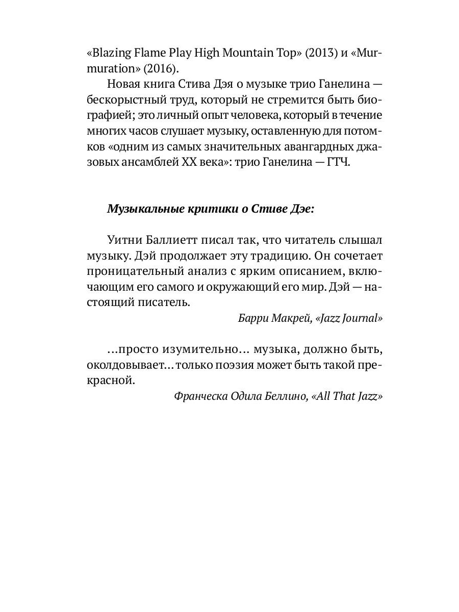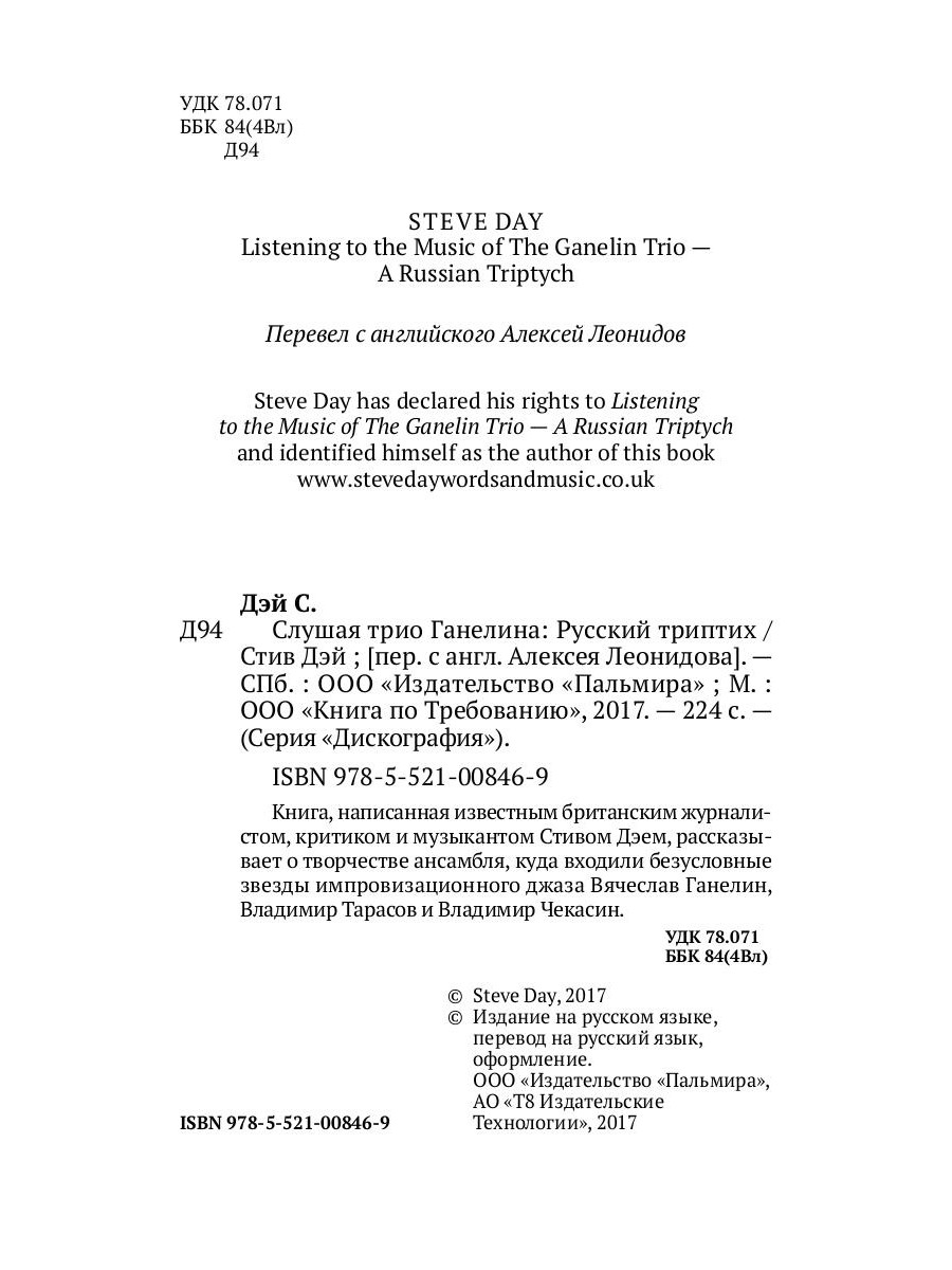 Книга, написанная известным британским журналистом, критиком и музыкантом Стивом Дэем, рассказывает о творчестве ансамбля, куда входили безусловные звезды импровизационного джаза Вячеслав Ганелин, Владимир Тарасов и Владимир Чекасин.