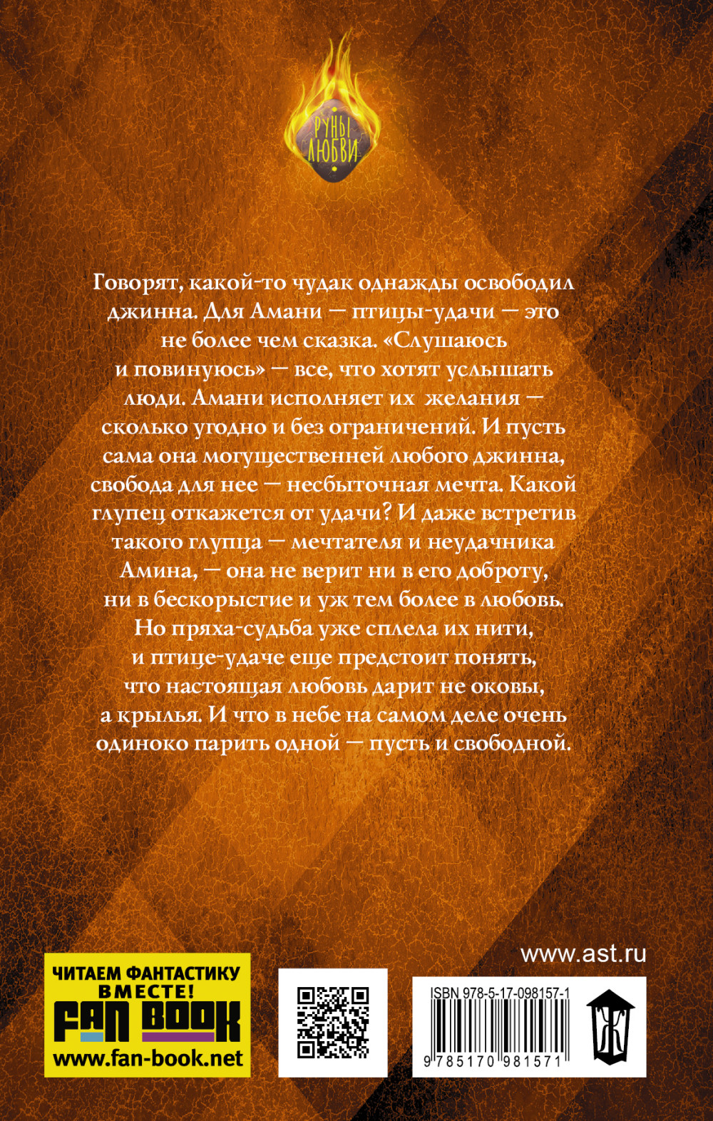 Говорят, какой-то чудак однажды освободил джина. Для Амани - птицы-удачи - это не более чем сказка. «Слушаюсь и повинуюсь», - все, что хотят услышать люди. Амани исполняет их желания - сколько угодно и без ограничений. И пусть сама она могущественней любого джина, свобода для нее - несбыточная мечта. Какой глупец откажется от удачи? И даже встретив такого глупца - мечтателя и неудачника Амина, - она не верит ни в его доброту, ни в бескорыстие и уж тем более в любовь. Но пряха-судьба уже сплела их нити, и птице-удаче еще предстоит понять, что настоящая любовь дарит не оковы, а крылья. И что в небе на самом деле очень одиноко парить одной - пусть и свободной.