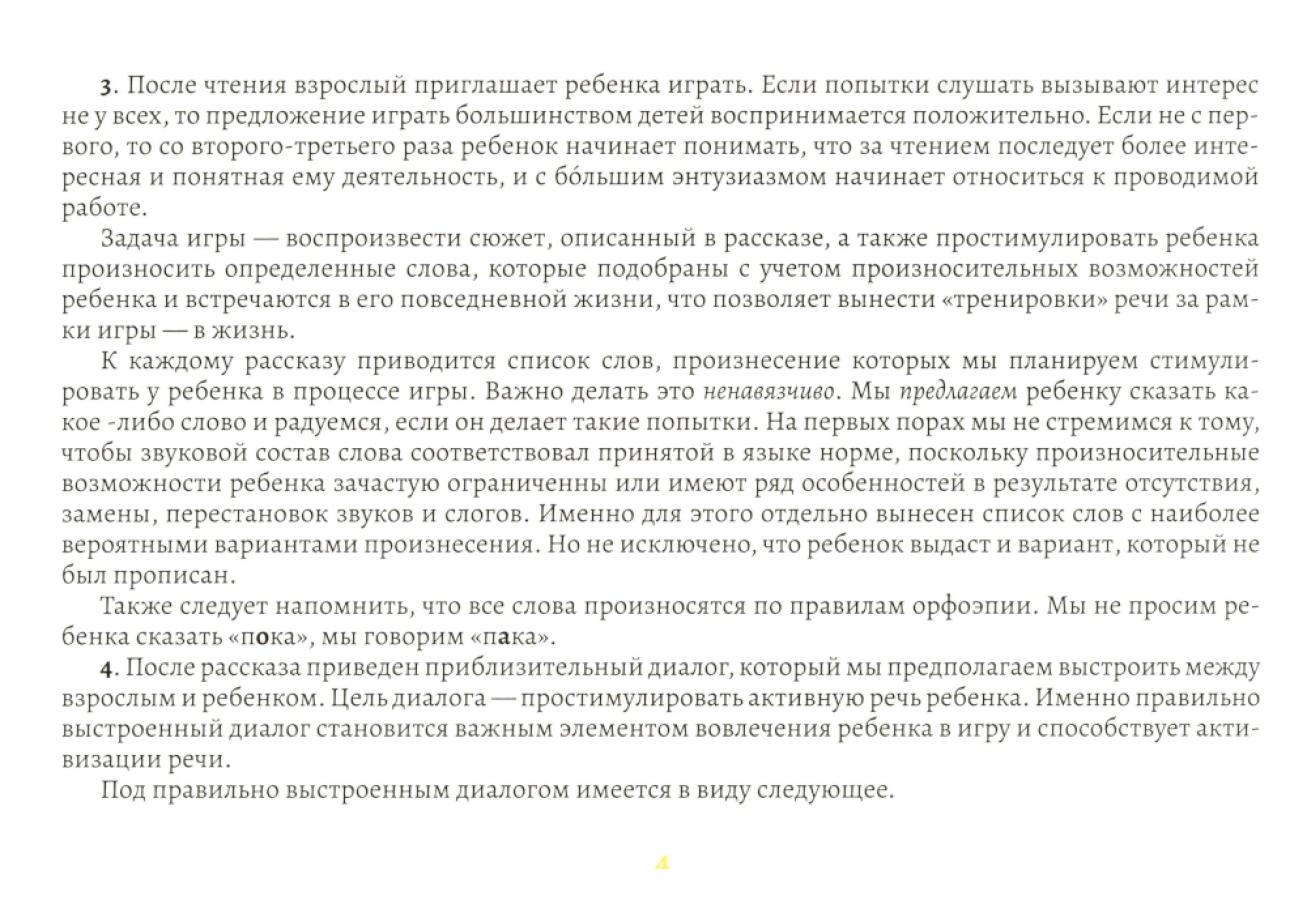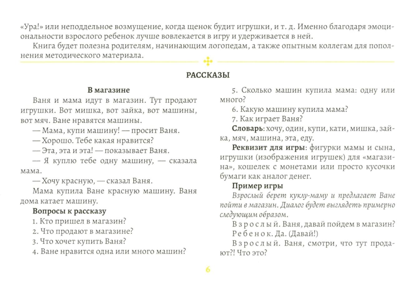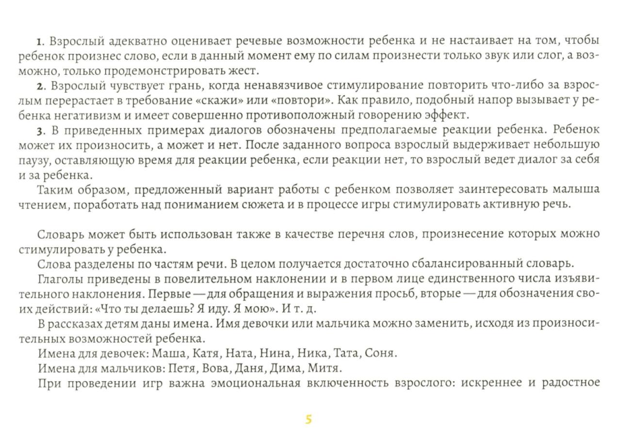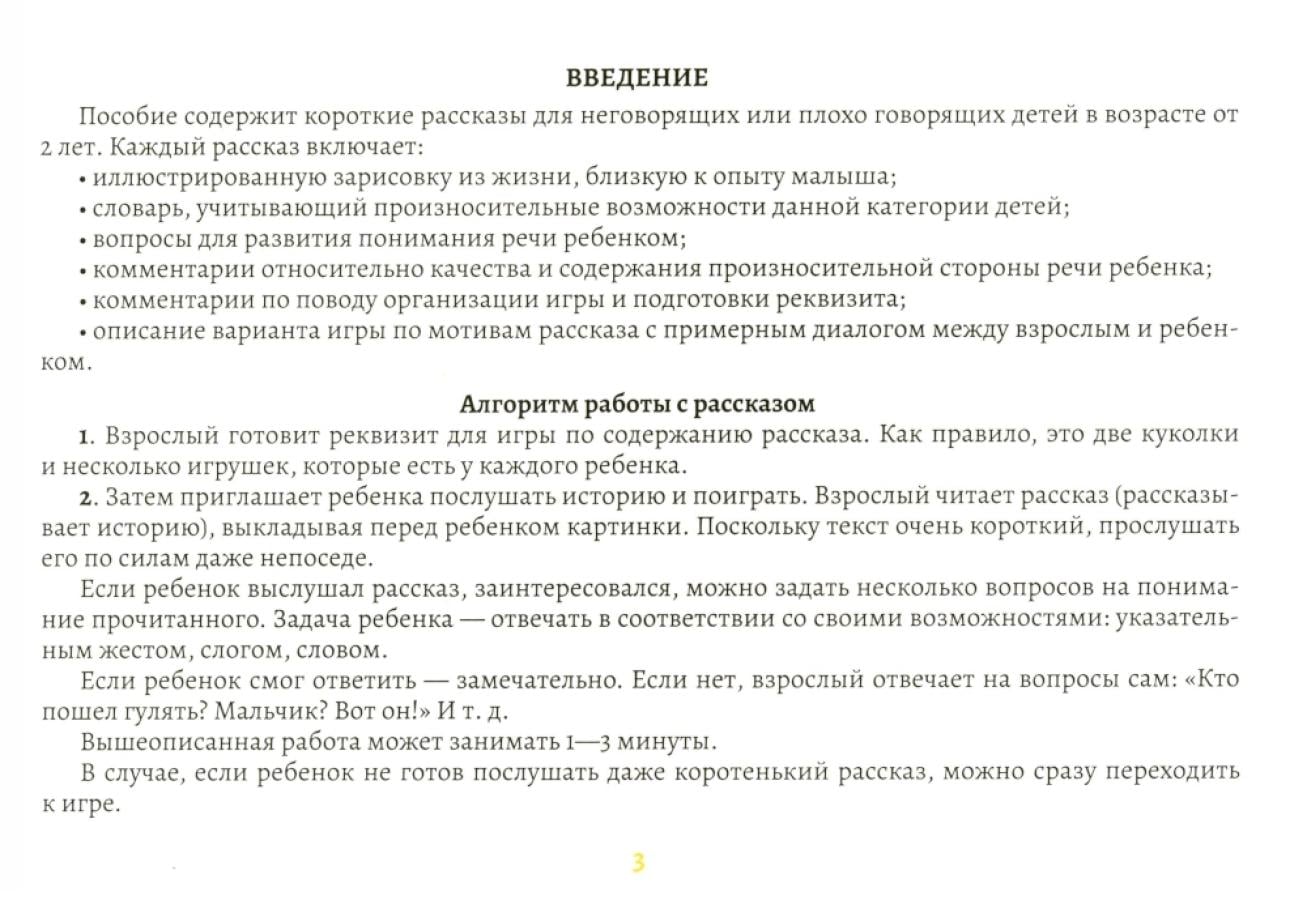 Пособие содержит короткие рассказы для неговорящих или плохо говорящих детей в возрасте от 2 лет. Каждый рассказ включает иллюстрированную зарисовку из жизни, близкую к опыту малыша; словарь, учитывающий произносительные возможности данной категории детей; вопросы для развития понимания речи ребенком; описание варианта игры по мотивам рассказа с примерным диалогом между взрослым и ребенком. Задача игры- воспроизвести сюжет, описанный в рассказе, а также прости мулировать ребенка произносить определенные слова, которые подобраны с учетом произносительных возможностей ребенка и встречаются в его повседневной жизни, что позволяет вынести «тренировки» речи за рамки игры- в жизнь. Книга будет полезна родителям, начинающим логопедам, а также опытным коллегам для пополнения методического материала.