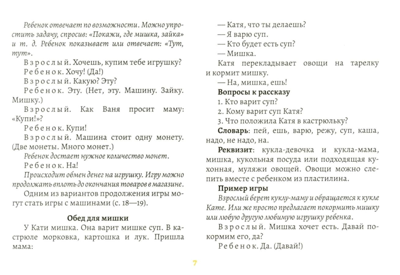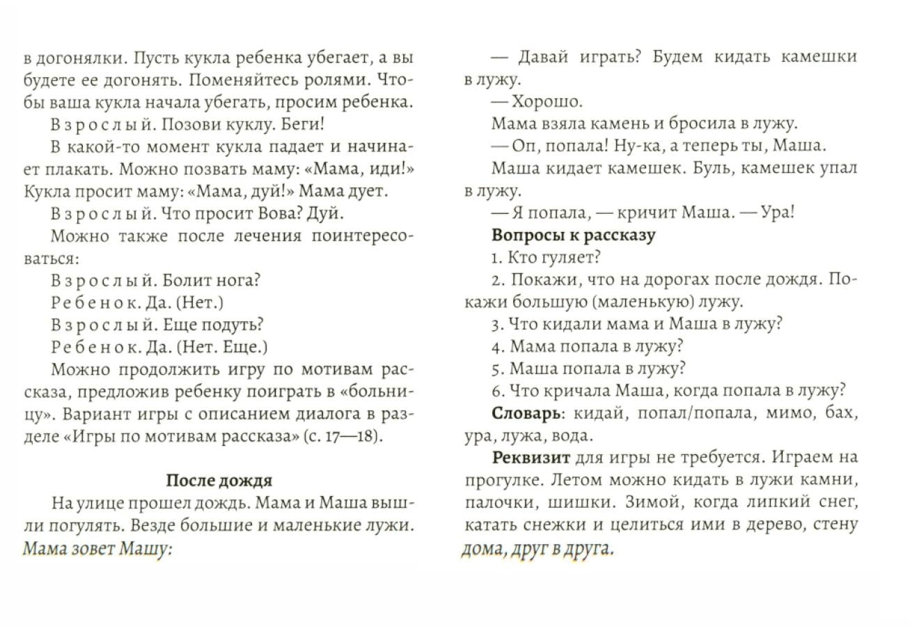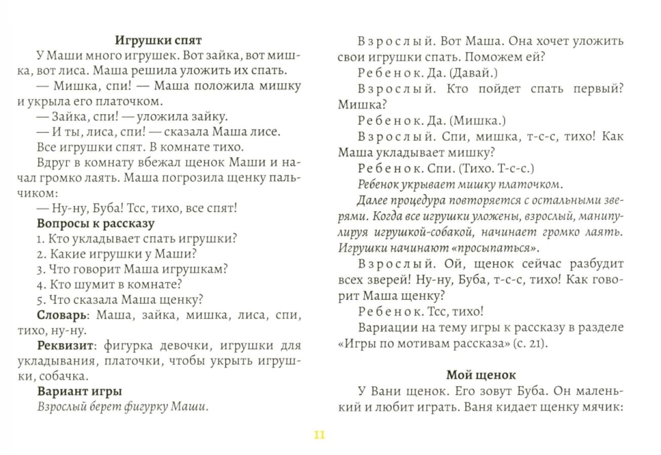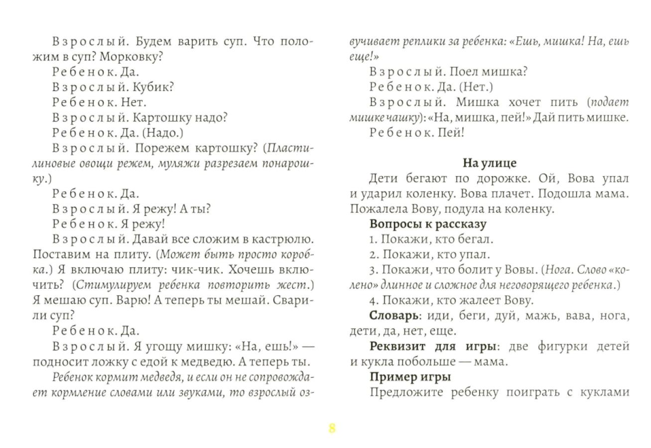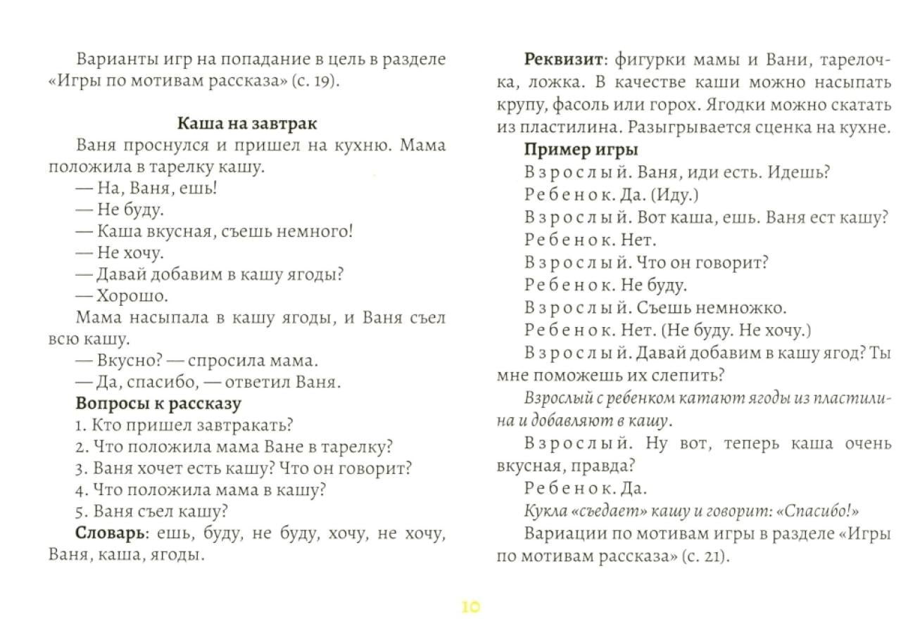 Пособие содержит короткие рассказы для неговорящих или плохо говорящих детей в возрасте от 2 лет. Каждый рассказ включает иллюстрированную зарисовку из жизни, близкую к опыту малыша; словарь, учитывающий произносительные возможности данной категории детей; вопросы для развития понимания речи ребенком; описание варианта игры по мотивам рассказа с примерным диалогом между взрослым и ребенком. Задача игры- воспроизвести сюжет, описанный в рассказе, а также прости мулировать ребенка произносить определенные слова, которые подобраны с учетом произносительных возможностей ребенка и встречаются в его повседневной жизни, что позволяет вынести «тренировки» речи за рамки игры- в жизнь. Книга будет полезна родителям, начинающим логопедам, а также опытным коллегам для пополнения методического материала.