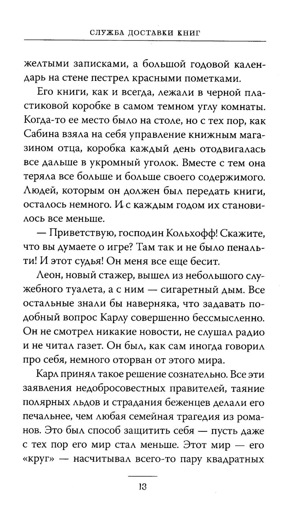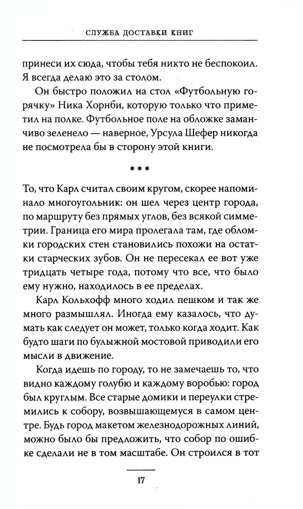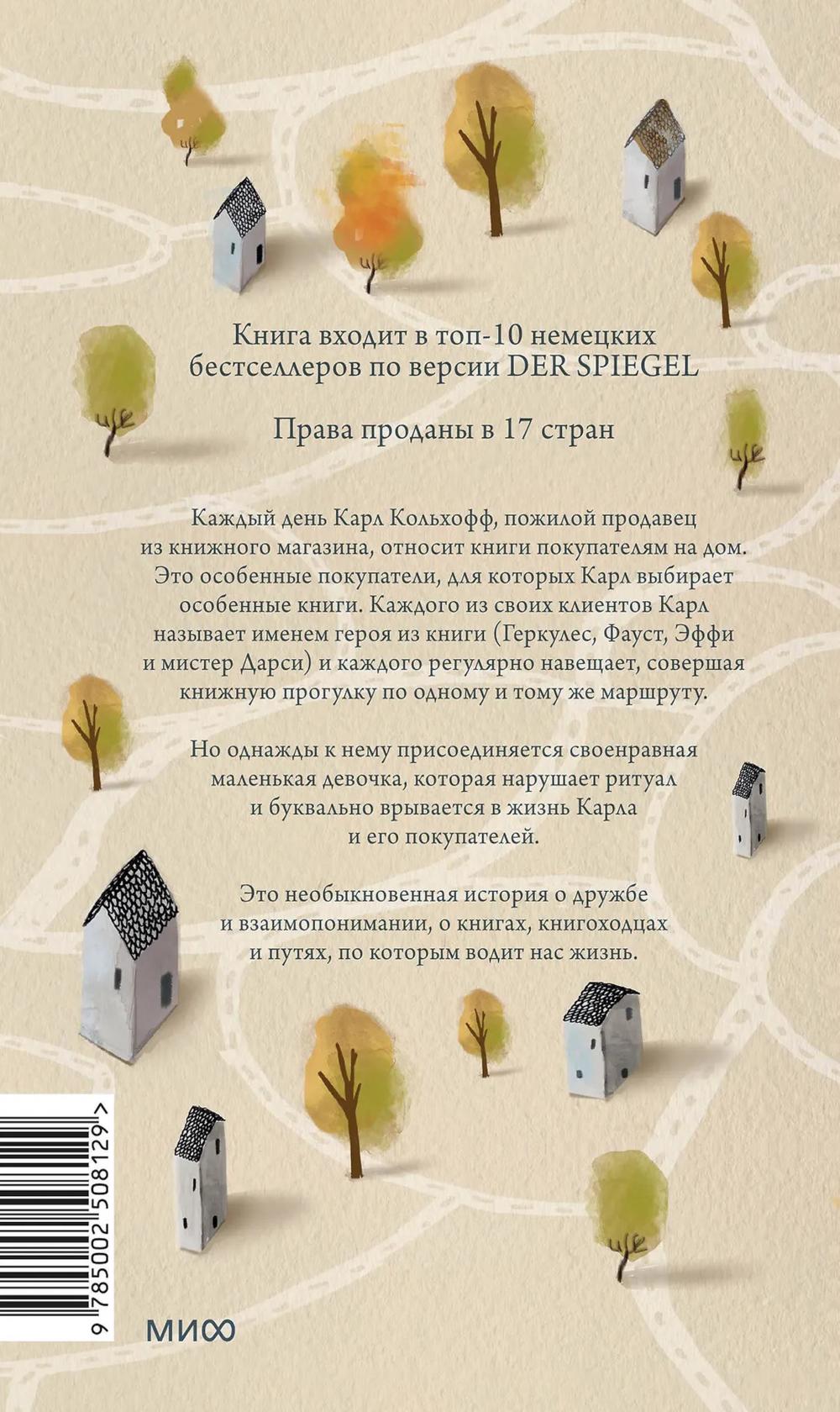 Каждый день Карл Кольхофф, пожилой продавец из книжного магазина, относит книги покупателям на дом. Это особенные покупатели, для которых Карл выбирает особенные книги. Каждого из своих клиентов Карл называет именем героя из книги (Геркулес, Фауст, Эффи и мистер Дарси) и каждого регулярно навещает, совершая книжную прогулку по одному и тому же маршруту. Но однажды к нему присоединяется девочка, которая нарушает ритуал и буквально врывается в жизнь Карла и его покупателей. Это необыкновенная история о дружбе и взаимопонимании, о книгах, книгоходцах и путях, по которым водит нас жизнь.| Издательство | Манн, Иванов и Фербер |