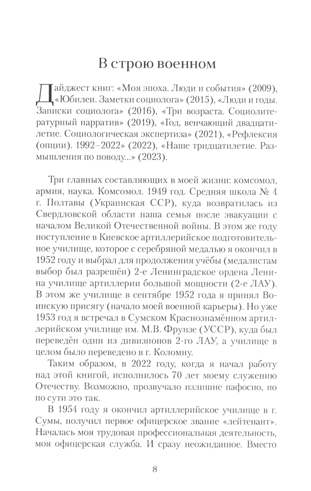 Накануне своего очередного юбилея (90-летия) известный советский и российский социолог и литератор делится с читателями своими воспоминаниями. Их действительно немало, и они действительно интересны для людей разных поколений. Для молодёжи особенно. Автор принадлежит к поколению «детей войны», на долю которого выпали серьёзные испытания. Великая Отечественная война, гибель близких, эвакуация, послевоенная разруха, восстановление, годы многочисленных социальных трансформаций, взлёты и падения, развал Советского Союза, постсоветское экспериментирование, поиск и обретение будущего великой страны. Автор являлся свидетелем и участником многих важных, судьбоносных для России, а значит, и для юбиляра, событий. Об этом всём откровенно рассказано в данной книге, адресованной широкому кругу читателей.
