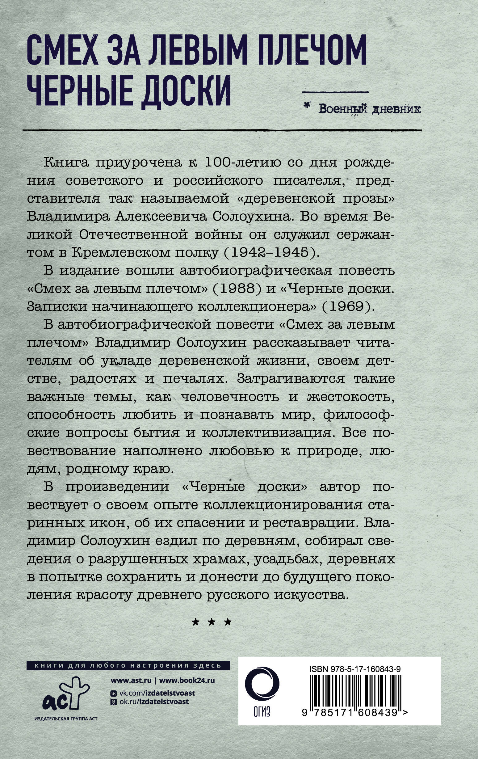 Книга приурочена к 100-летию со дня рождения советского и российского писателя, представителя так называемой "деревенской прозы" Владимира Алексеевича Солоухина. В издание вошли автобиографическая повесть "Смех за левым плечом" (1988) и "Черные доски. Записки начинающего коллекционера" (1969). В автобиографической повести "Смех за левым плечом" Владимир Солоухин рассказывает читателям об укладе деревенской жизни, своем детстве, радостях и печалях. Затрагиваются такие важные темы, как человечность и жестокость, способность любить и познавать мир, философские вопросы бытия и коллективизация. Все повествование наполнено любовью к природе, людям, родному краю. В произведении "Черные доски" автор повествует о своем опыте коллекционирования старинных икон, об их спасении и реставрации. Владимир Солоухин ездил по деревням, собирал сведения о разрушенных храмах, усадьбах, деревнях в попытке сохранить и донести до будущего поколения красоту древнего русского искусства.| Издательство | Издательство "АСТ" |