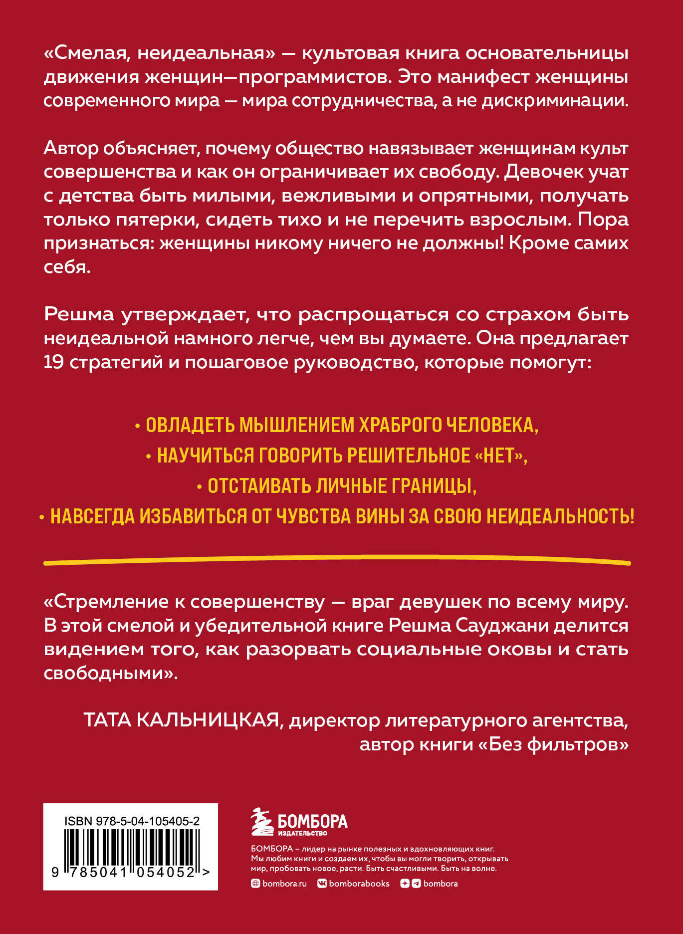 МЕЖДУНАРОДНЫЙ БЕСТСЕЛЛЕР ОБ АВТОРЕ Решма Сауджани - американский юрист и политик. Она является основателем технической организации Girls Who Code. Сауджани была первой американкой индийского происхождения (и первой американкой из Южной Азии), баллотировавшейся в КонгрессНью-Йорка. ОТЗЫВЫ «Совершенное - не только враг хорошего; стремление к совершенству - враг девушек по всему миру. В этой смелой и убедительной книге Решма Сауджани делится смелым видением того, как освободить девочек и женщин от оков социальных ожиданий ». - Адам Грант, автор бестселлеров New York Times. ЦИТАТЫ • Храбрость - наслаждаться самой собой, такой, какая ты есть, заявлять о себе громко, гордо и без извинений. • Чтобы стать первым в каком-либо деле, выйти на новый уровень, требуется мужество. • Действительно смело уважать себя настолько, чтобы сказать «нет» тому, чего не хочешь делать, особенно если это может разочаровать друга или любимого человека.| Издательство | ООО "Издательство "Эксмо" |
