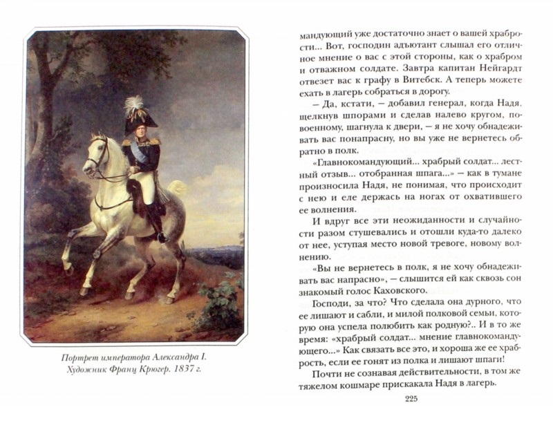 Историческая повесть известной писательницы Лидии Чарской "Смелая жизнь", написанная в 1905 году, рассказывает об удивительной, полной неожиданных приключений судьбе девушки-дворянки, пренебрегшей всеми условностями своего круга, выбравшей несвойственный женщине путь кавалериста императорской армии. Движимая патриотическим порывом, она совершает многие подвиги, показывая чудеса храбрости, которые становятся известны императору Александру I. У героини этой истории есть прототип - Дурова Надежда Андреевна (1783-1866) - первая женщина-офицер царской армии и талантливая писательница, творчество которой ценил А.С. Пушкин. Написанные ею "Записки кавалерист-девицы" имели огромный успех.