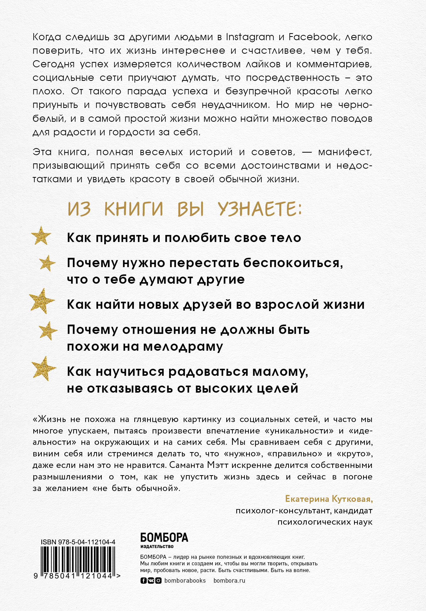 Когда следишь за другими людьми в Instagram и Facebook, легко поверить, что их жизнь интереснее и счастливее, чем у тебя. Сегодня успех измеряется количеством лайков и комментариев, социальные сети приучают думать, что посредственность - это плохо. От такого парада успеха и безупречной красоты легко приуныть и почувствовать себя неудачником. Но мир не черно-белый, и в самой простой жизни можно найти множество поводов для радости и гордости за себя. Эта книга, полная веселых историй и советов, - манифест, призывающий принять себя со всеми достоинствами и недостатками и увидеть красоту в своей обычной жизни.| Издательство | ООО "Издательство "Эксмо" |
