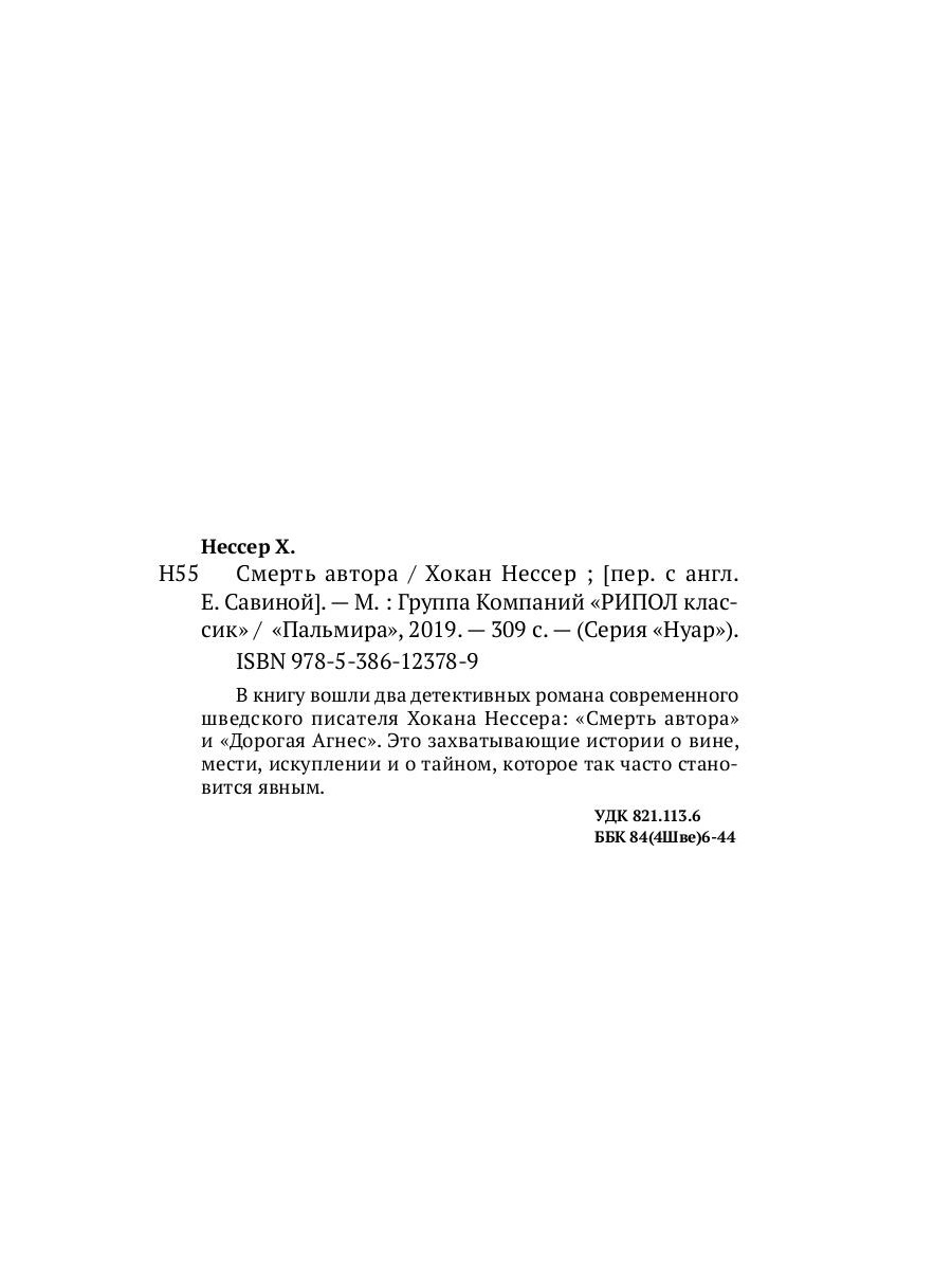 В книгу вошли два детективных романа современного шведского писателя Хокана Нессера: «Смерть автора» и «Дорогая Агнес». Это захватывающие истории о вине, мести, искуплении и о тайном, которое так часто становится явным.| Издательство | Рипол Классик |