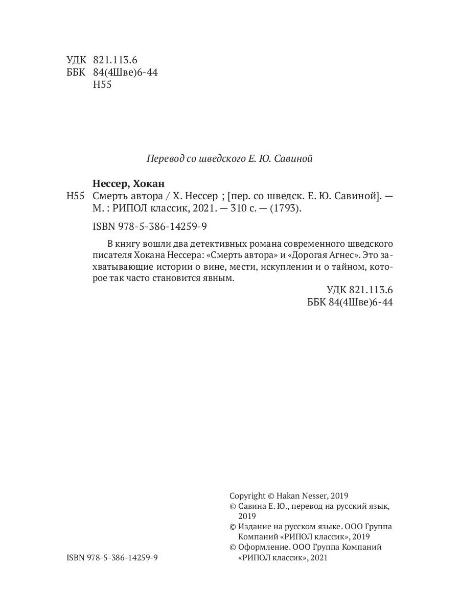 В книгу вошли два детективных романа современного шведского писателя Хокана Нессера: «Смерть автора» и «Дорогая Агнес». Это захватывающие истории о вине, мести, искуплении и о тайном, которое так часто становится явным.| Издательство | Рипол Классик |