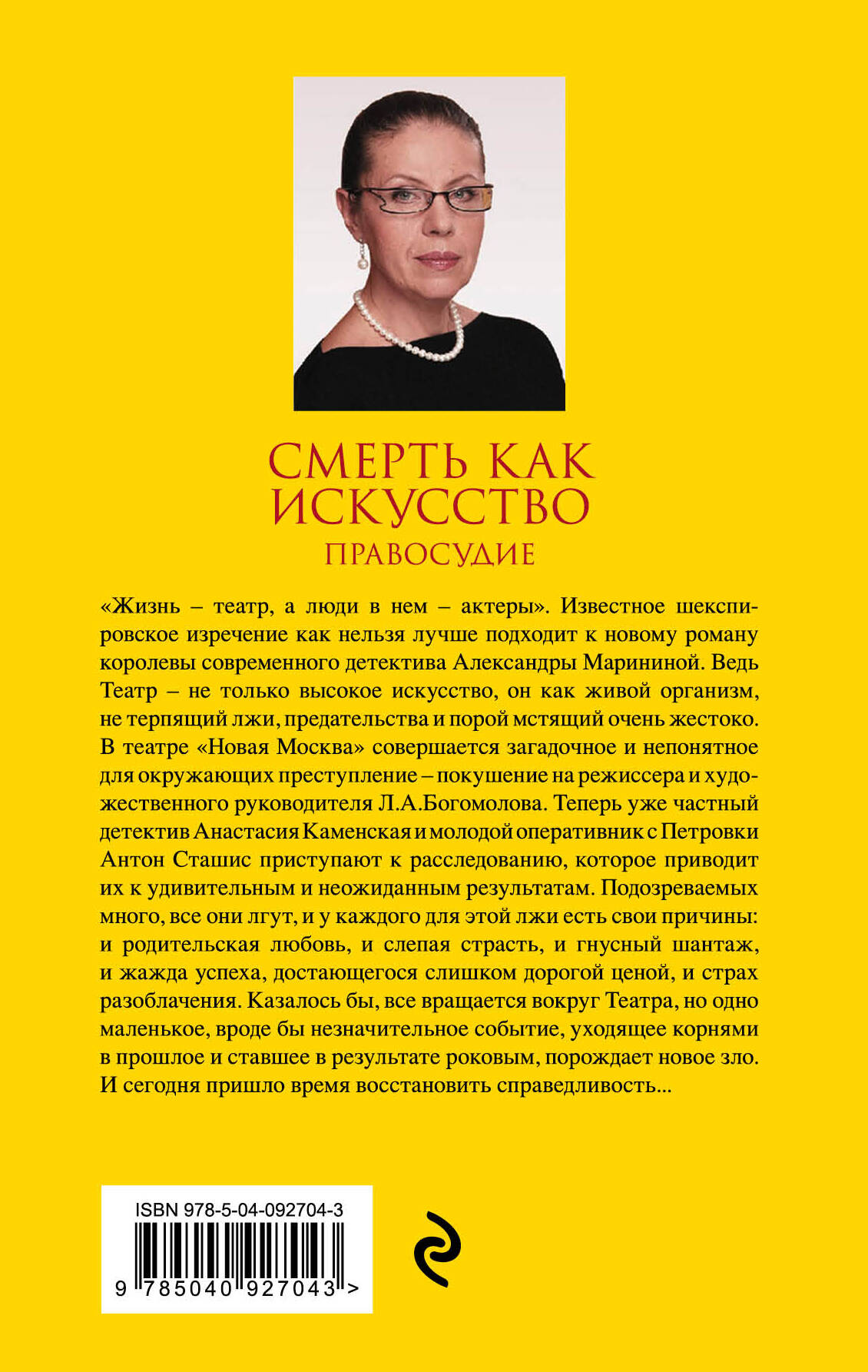 "Жизнь - театр, а люди в нем - актеры". Известное шекспировское изречение как нельзя лучше подходит к новому роману королевы современного детектива Александры Марининой. Ведь Театр - не только высокое искусство, он как живой организм, не терпящий лжи, предательства и порой мстящий очень жестоко. В театре "Новая Москва" совершается загадочное и непонятное для окружающих преступление - покушение на режиссера и художественного руководителя Л.А.Богомолова. Теперь уже частный детектив Анастасия Каменская и молодой оперативник с Петровки Антон Сташис приступают к расследованию, которое приводит их к удивительным и неожиданным результатам. Подозреваемых много, все они лгут, и у каждого для этой лжи есть свои причины: и родительская любовь, и слепая страсть, и гнусный шантаж, и жажда успеха, достающегося слишком дорогой ценой, и страх разоблачения. Казалось бы, все вращается вокруг Театра, но одно маленькое, вроде бы незначительное событие, уходящее корнями в прошлое и ставшее в результате роковым, порождает новое зло. И сегодня пришло время восстановить справедливость...| Издательство | ООО "Издательство "Эксмо" |