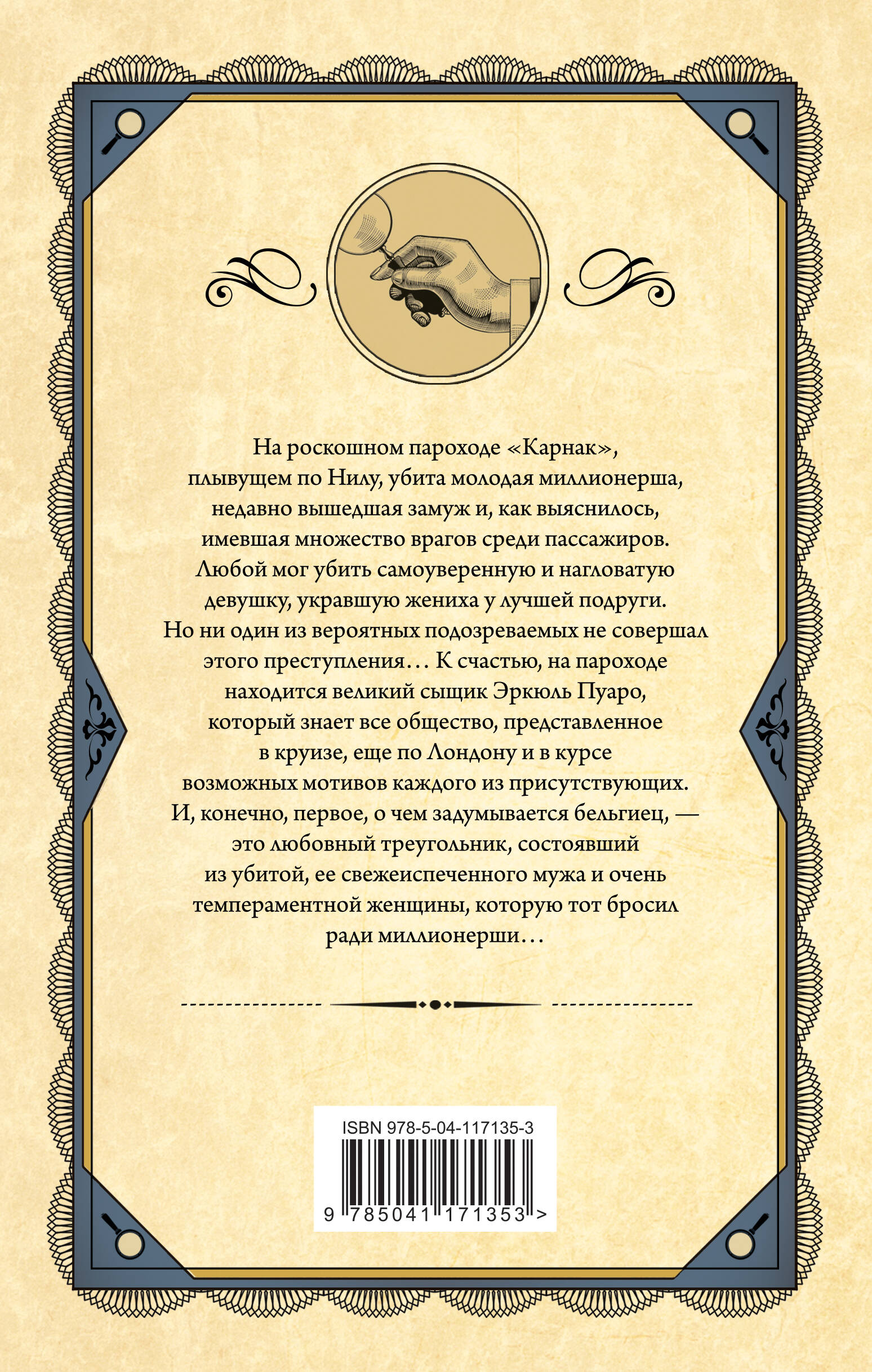 Этот роман является прямым продолжением «Убийства в "Восточном экспрессе"» - и практически ничем не уступает «детективу всех времен и народов». На роскошном пароходе «Карнак», плывущем по Нилу, убита молодая миллионерша, недавно вышедшая замуж и, как выяснилось, имевшая множество врагов среди пассажиров. Любой мог убить самоуверенную и нагловатую девушку, укравшую жениха у лучшей подруги. Но ни один из вероятных подозреваемых не совершал этого преступления… К счастью, на пароходе находится великий сыщик Эркюль Пуаро, который знает все общество, представленное в круизе, еще по Лондону и в курсе возможных мотивов каждого из присутствующих. И, конечно, первое, о чем задумывается бельгиец - это о «любовном треугольнике», состоявшем из убитой, ее свежеиспеченного мужа и очень темпераментной женщины, которую тот бросил ради миллионерши… «Одно из лучших дел Пуаро». - Sunday Times «Миссис Кристи делает невозможную историю абсолютно реальной». - The Times «Несомненно, она гений». - Элизабет Джордж, автор бестселлеров New York Times «Общепринято считать Кристи блестящим мастером острого сюжета. Однако она представляет собой нечто гораздо более значительное». - The Guardian «Безупречный сюжет». - Daily Mail «Нужно сразу читать дважды: первый раз наслаждаться, второй - следить за хитросплетениями». - The Times «…Я до сих пор обожаю романы Кристи». - Луиза Пенни «Читать роман Кристи - словно вгрызаться в спелое яблоко: чистейшее, хрустящее и абсолютное удовлетворение…» - Тана Френч| Издательство | ООО "Издательство "Эксмо" |