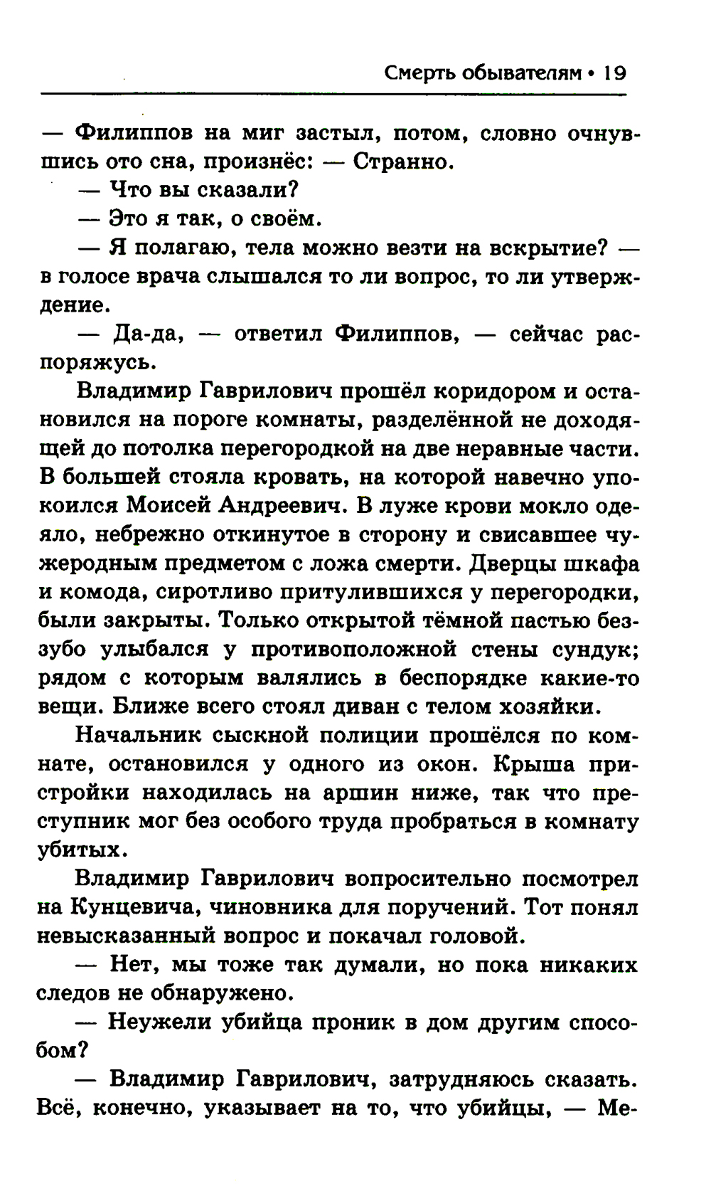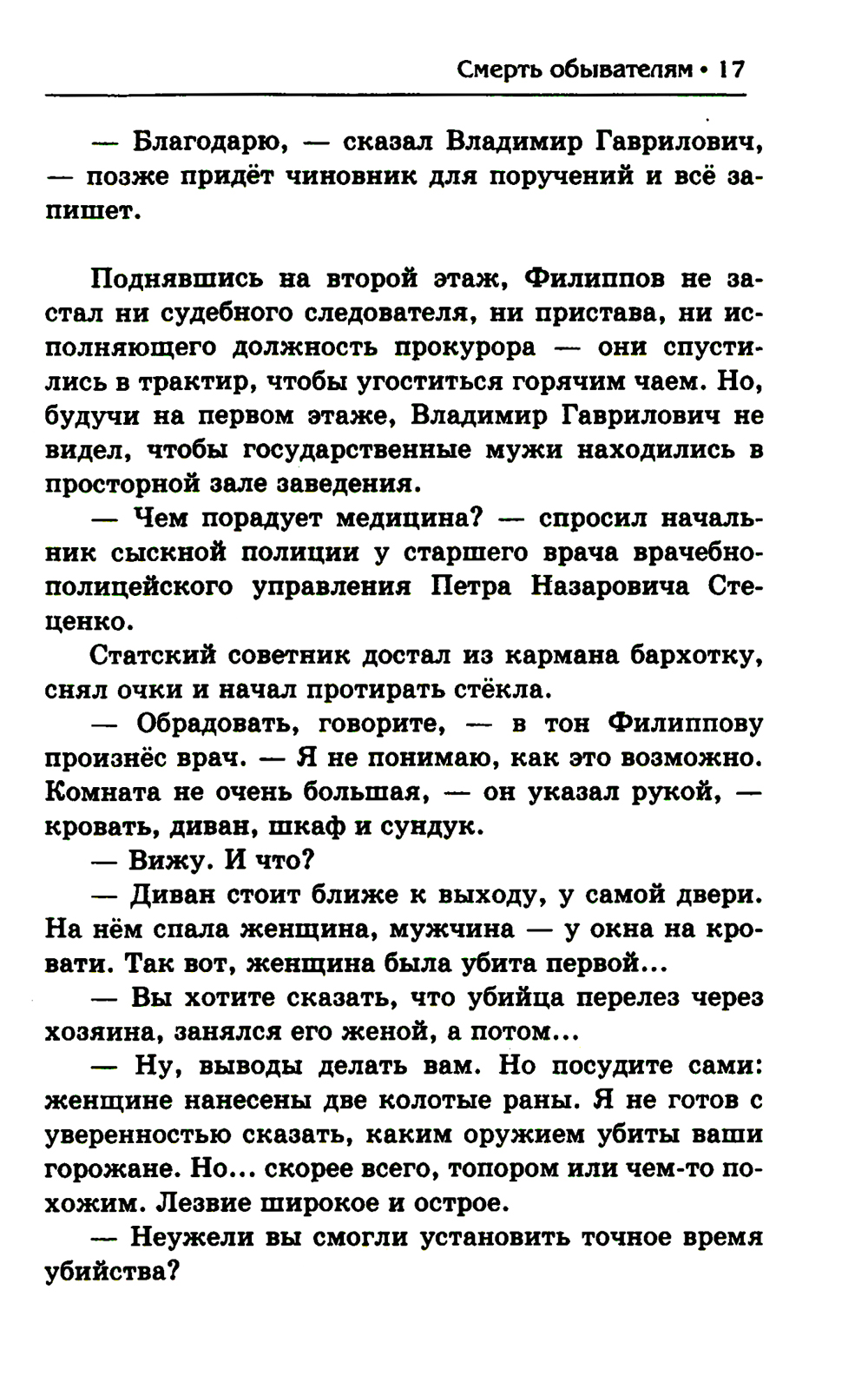 Начало XX века. Санкт-Петербург. В одном из тихих обывательских кварталов происходят убийства. Неизвестный душегуб принялся убивать топором целые семьи. Преступления страшные, но с первого взгляда незамысловатые и не сулящие долгого расследования. Тем более за дело берется начальник сыскной полиции Владимир Гаврилович Филиппов и его бригада опытных расследователей. Однако уже с первых шагов дознание обнаруживает некоторые странности в картине преступления. Кто этот безумный маньяк? Один ли это человек? Какие на самом деле у него мотивы убивать безобидных граждан особо жестоким образом? Странностей и сложностей в деле становится всё больше, расследование уводит сыщиков далеко за пределы Санкт-Петербурга, вплоть до самой Финляндии. Нити сплетаются в тугой клубок, распутать который под силу только начальнику сыскной полиции Филиппову и его подручным.| Издательство | Крылов |