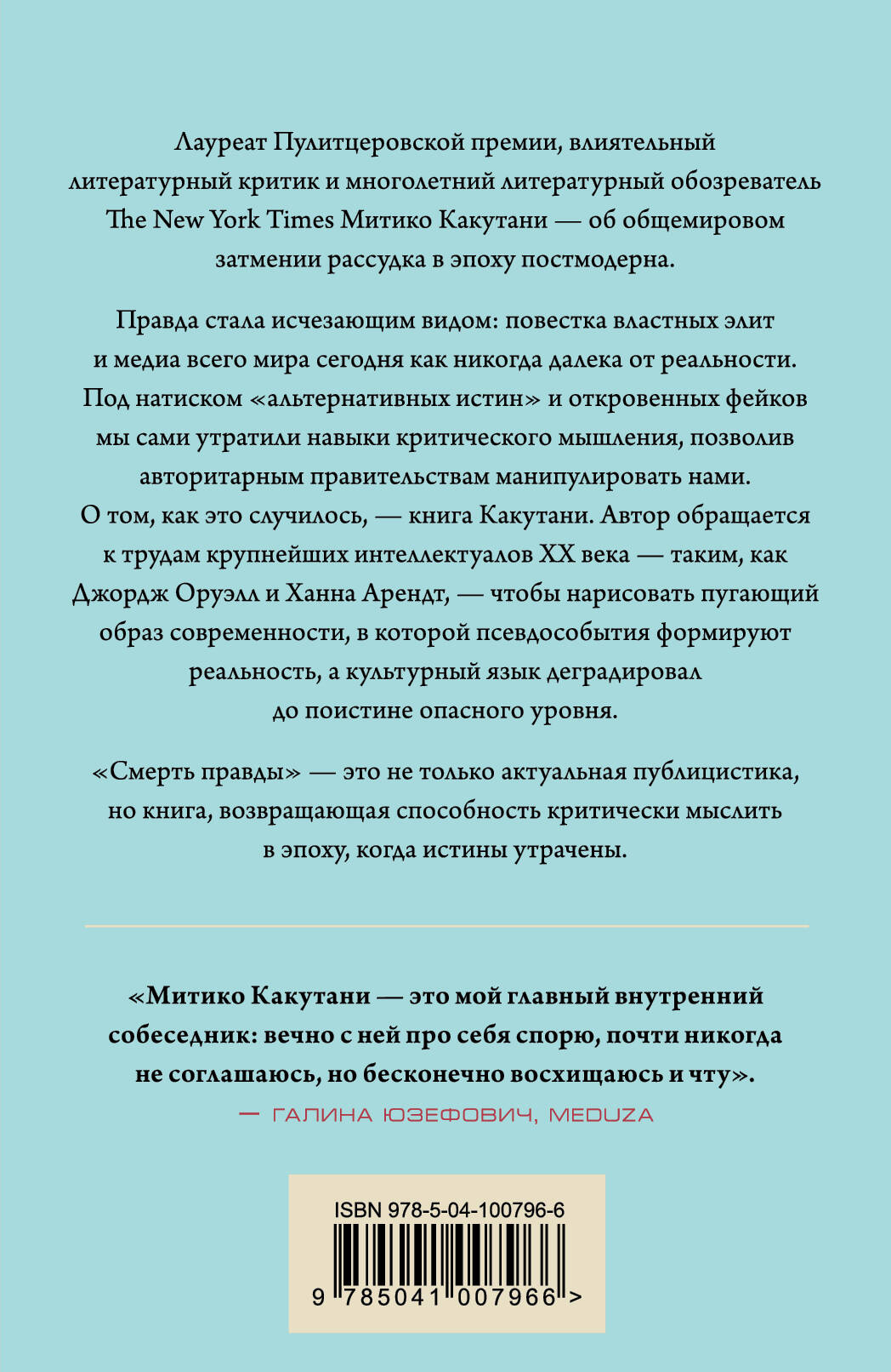 «Книга про лапшеснималочную историю: Трампа, Гитлера, Путина, риторику политиков и их язык. Как эмоциями подменяют логику, как в белом шуме теряется разум индивидов. Эта книга актуальна для тех, кто, как и я, изучает защиту от манипуляций и считает важным критическое мышление: ряд примеров из книги позволяет понять, что верить на слово нельзя вообще никогда и никому». - Алена Попова, правозащитница «Митико Какутани - это мой главный внутренний собеседник: вечно с ней про себя спорю, почти никогда не соглашаюсь, но бесконечно восхищаюсь и чту». - Галина Юзефович, Meduza «Последовательно, уверенно и обоснованно Какутани клеймит современное общество, культуру постмодерна и деформацию языка, оставаясь при этом верной своей миссии литературного критика». - Наталия Ломыкина, Forbes «Это потрясающая книга, которая показывает всю лживость современного мира, напичканного пропагандой в социальных сетях и пустой политической риторикой». - Esquire «Эта книга могла быть написана только тем человеком, который читает, осмысляет и хранит для потомков больше, чем простые смертные». - TIME| Издательство | ООО "Издательство "Эксмо" |