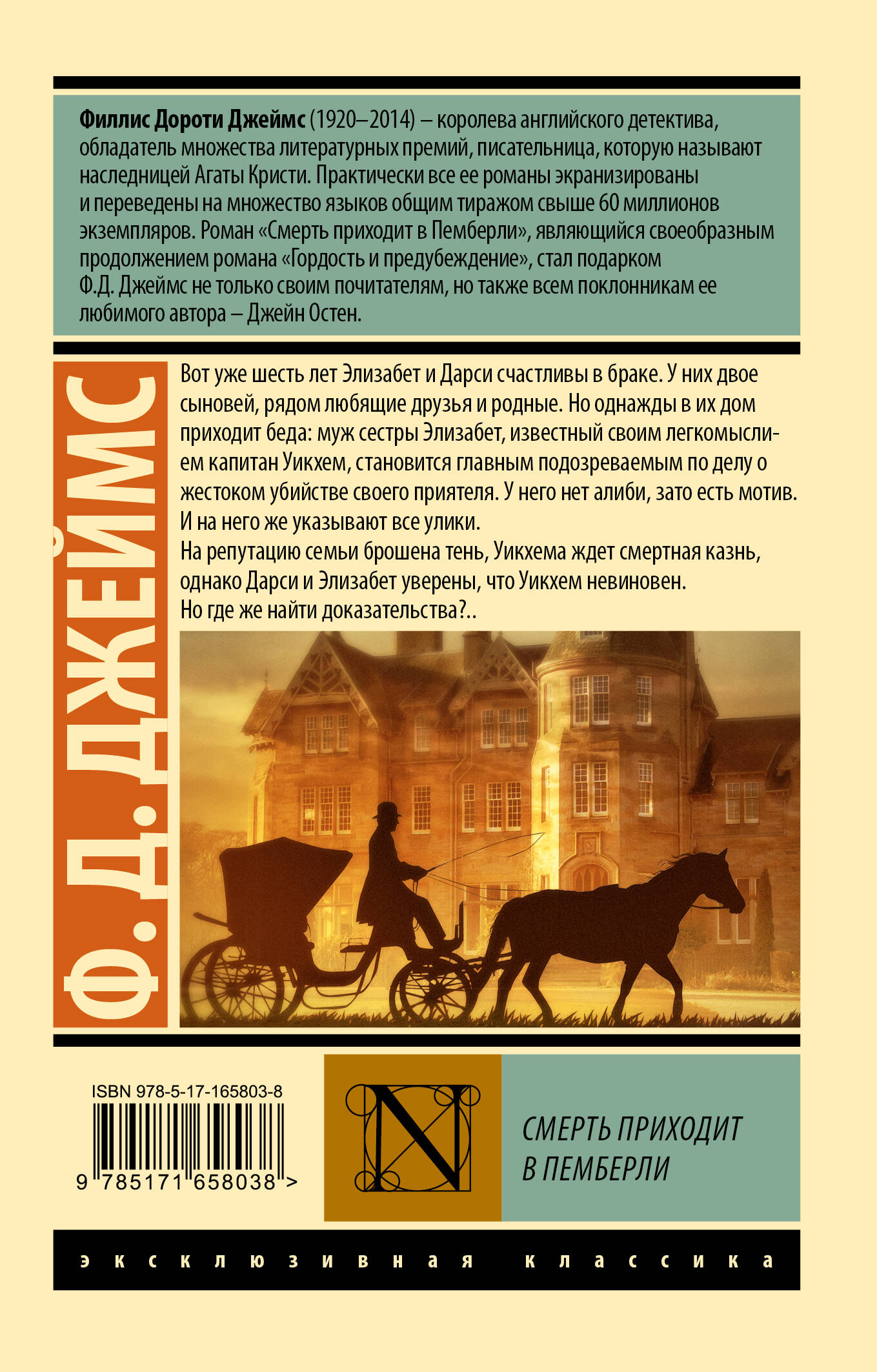 Филлис Дороти Джеймс (1920-2014) - королева английского детектива, обладатель множества литературных премий, писательница, которую называют наследницей Агаты Кристи. Практически все ее романы экранизированы и переведены на множество языков общим тиражом свыше 60 миллионов экземпляров. Роман "Смерть приходит в Пемберли", являющийся своеобразным продолжением романа "Гордость и предубеждение", стал не только подарком Ф.Д. Джеймс своим почитателям, но также всем поклонникам ее любимого автора - Джейн Остен. Вот уже шесть лет Элизабет и Дарси счастливы в браке. У них двое сыновей, рядом любящие друзья и родные. Но однажды в их дом приходит беда: муж сестры Элизабет, известный своим легкомыслием капитан Уикхем, становится главным подозреваемым по делу о жестоком убийстве своего приятеля. У него нет алиби, зато есть мотив. И на него же указывают все улики. На репутацию семьи брошена тень, Уикхема ждет смертная казнь, однако Дарси и Элизабет уверены, что Уикхем невиновен. Но где же найти доказательства?..