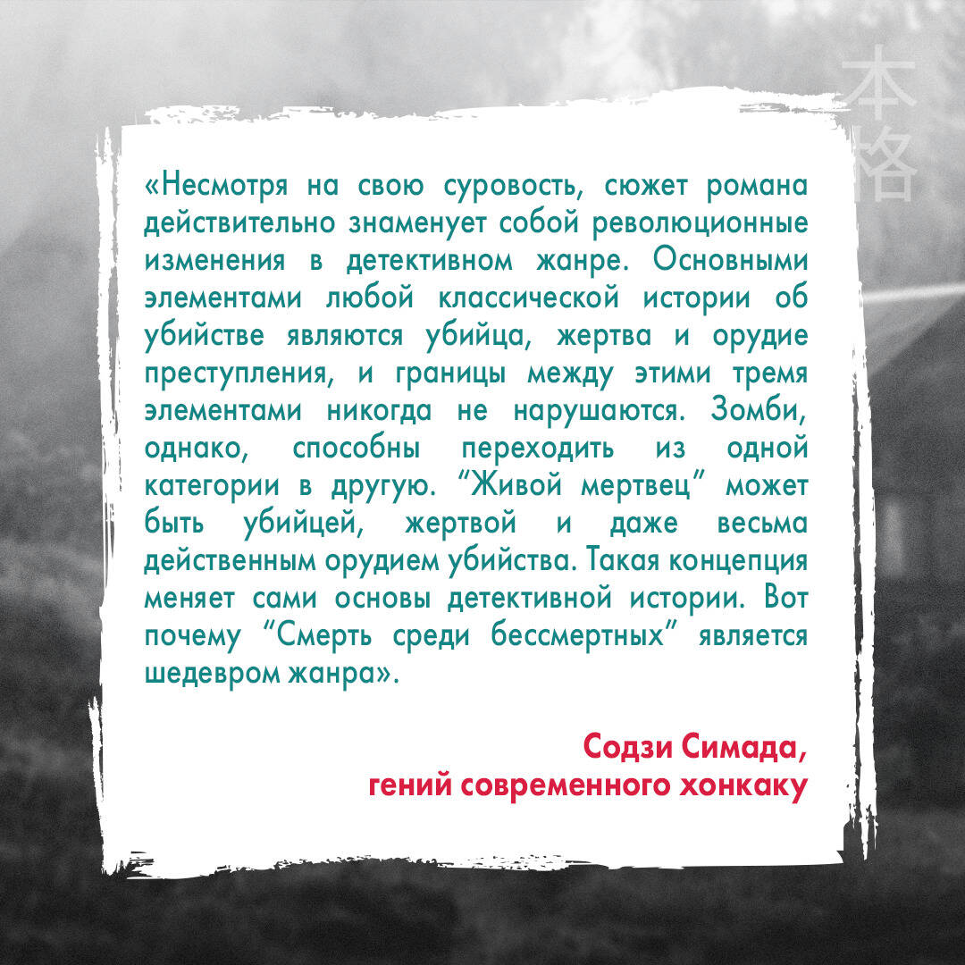 НАЦИОНАЛЬНЫЙ БЕСТСЕЛЛЕР ЯПОНИИ. ЕДИНСТВЕННЫЙ РОМАН, ЗАНЯВШИЙ ПЕРВОЕ МЕСТО СРАЗУ ВО ВСЕХ ЧЕТЫРЕХ ОСТРОСЮЖЕТНЫХ РЕЙТИНГАХ СТРАНЫ. ОБЛАДАТЕЛЬ ПРЕМИЙ HONKAKU MYSTERY AWARD И AYUKAWA TETSUYA AWARD. ЭКРАНИЗИРОВАН В ЯПОНИИ. Студенческий клуб киноведов собирается провести ежегодное выездное заседание на вилле одного из своих выпускников. Туда очень хотят попасть трое студентов из другого клуба - любителей детективов. Им стало известно, что кто-то подбросил в штаб киноведов записку со словами: «Кто будет жертвой в этом году?». Детективы знают, что год назад там произошла трагедия, и во что бы то ни стало хотят раскрыть эту загадку… Да, на вилле скрывается преступник, и он уже разработал свой черный замысел. Но его планам, как и планам трех «сыщиков», суждено резко поменяться. В результате биотеррористической атаки окрестные леса заполняются… толпами зомби! Они блокируют виллу и идут на штурм. Теперь никто не сможет покинуть ее пределы. А между тем загадочным образом погибает председатель клуба. И начинается противостояние убийцы, вооруженного хитростью, и детективов, вооруженных дедукцией… ___________________________________________________________ «Несмотря на свою суровость, сюжет романа действительно знаменует собой революционные изменения в детективном жанре. Основными элементами любой классической истории об убийстве являются убийца, жертва и орудие преступления, и границы между этими тремя элементами никогда не нарушаются. Зомби, однако, способны переходить из одной категории в другую. "Живой мертвец" может быть убийцей, жертвой и даже весьма действенным орудием убийства. Такая концепция меняет сами основы детективной истории. Вот почему "Смерть среди бессмертных" является шедевром жанра». - Содзи Симада, гений современного хонкаку «Эта вариация головоломки замкнутого круга, присущей "золотому веку" детектива, крайне изобретательна… Креативность Имамуры открывает новые возможности для разгадки герметичного пазла». - Publishers Weekly «Это выдающийся, впечатляющий и захватывающий роман, который обязательно нужно прочитать любителям жанра. Помимо чисто детектива, это еще и восхитительный триллер. Решения невозможных убийств весьма умны и оригинальны. Интрига держится на протяжении всей книги до самого конца. Это загадка "честной игры", поскольку в ней представлены все подсказки, хотя я сомневаюсь, что читатель сможет справиться с задачей… Настоятельно рекомендуется к прочтению». - Goodreads| Издательство | ООО "Издательство "Эксмо" |