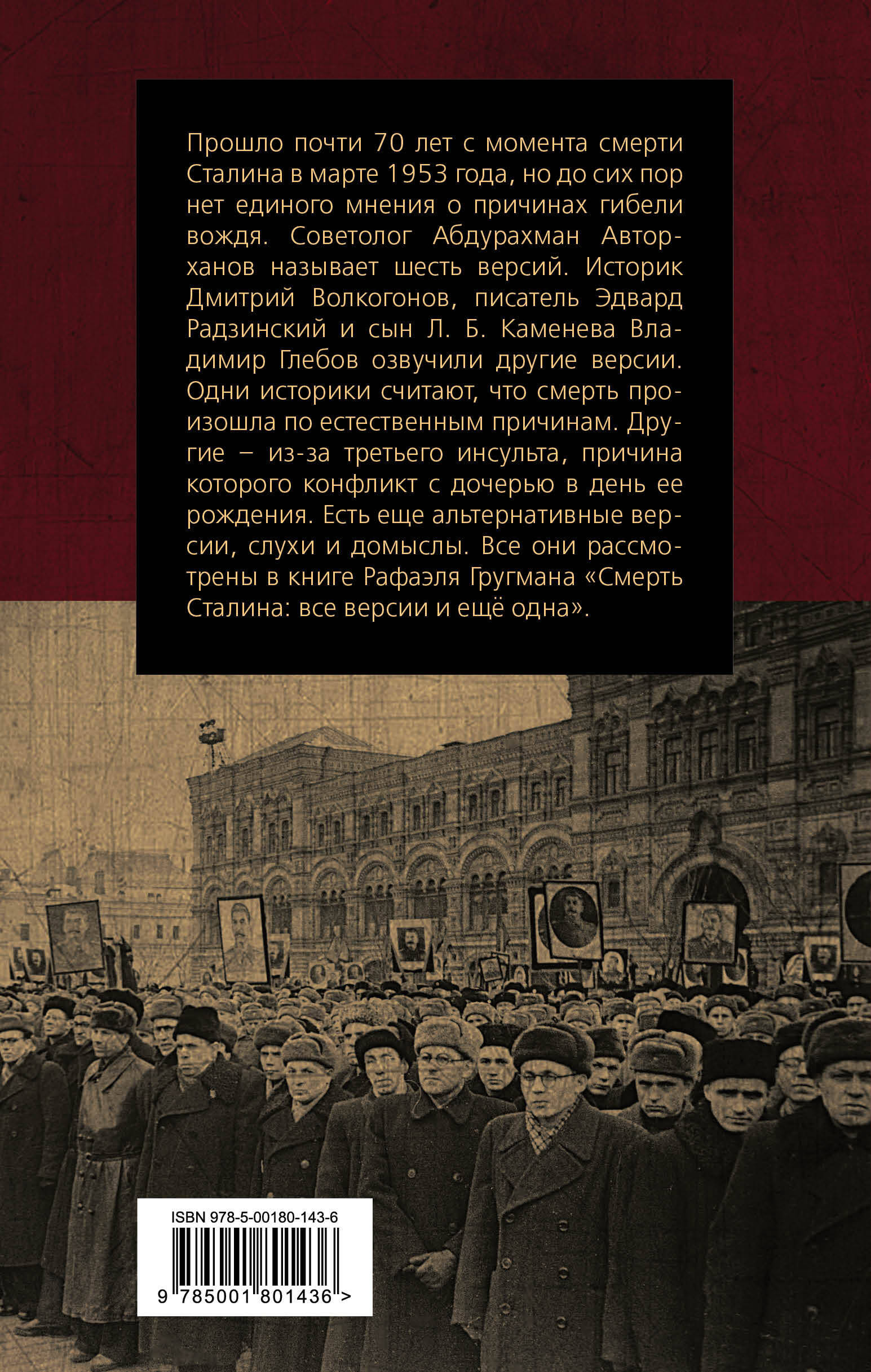 Прошло почти 70 лет с момента смерти Сталина в марте 1953 года, но до сих пор нет единого мнения о причинах гибели Вождя. Советолог Абдурахман Авторханов называет шесть версий. Историк Дмитрий Волкогонов, писатель Эдвард Радзинский и сын Л. Б. Каменева Владимир Глебов озвучили другие версии. Одни историки считают, что смерть произошла по естественным причинам. Другие - из-за третьего инсульта, причина которого конфликт с дочерью в день ее рождения. Есть еще альтернативные версии, слухи и домыслы. Все они рассмотрены в книге Рафаэля Гругмана «Смерть Сталина: все версии и еще одна».| Издательство | Родина Издательство ООО |