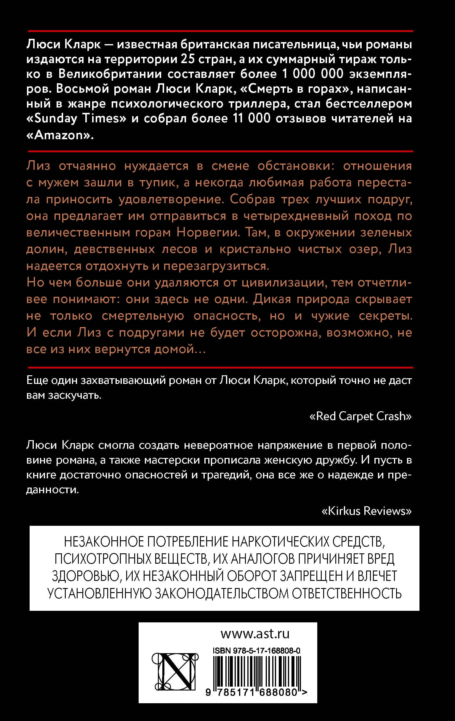 - От автора романов «Виновато море», «Убийство на острове» и «Мой чужой дом». - Люси Кларк - известная британская писательница, книги которой переведены на 25 языков и разошлись тиражом свыше миллиона экземпляров только в Великобритании. - Два романа Люси Кларк адаптированы для телеэкранов, еще три - готовятся к экранизации. - «Смерть в горах» - захватывающий психологический триллер о выживании в горах и женской дружбе.| Издательство | Издательство "АСТ" |