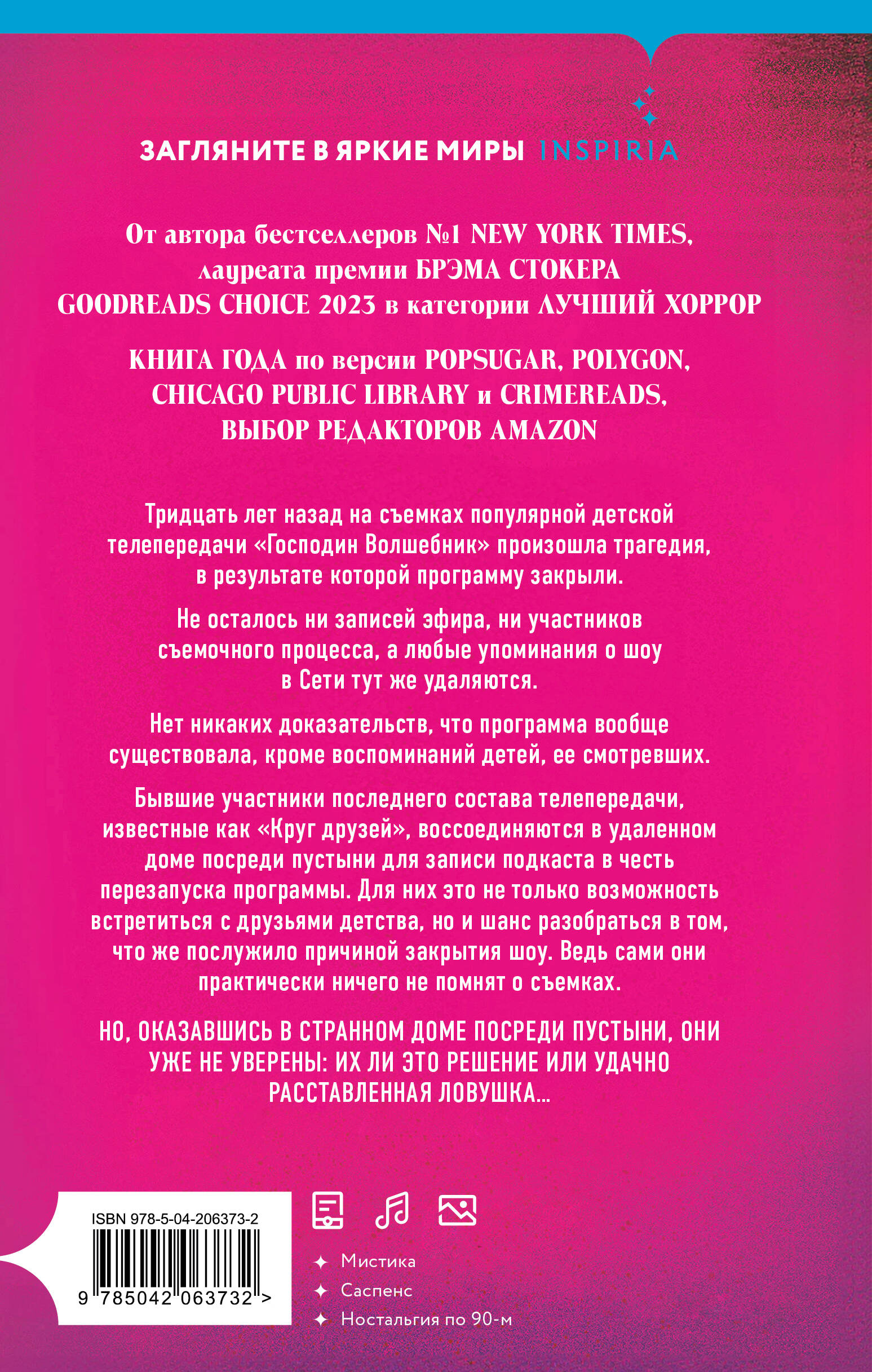 ОТ АВТОРА БЕСТСЕЛЛЕРОВ № 1 NEW YORK TIMES, ЛАУРЕАТА ПРЕМИИ БРЭМА СТОКЕРА. GOODREADS CHOICE 2023 В КАТЕГОРИИ ЛУЧШИЙ ХОРРОР. КНИГА ГОДА ПО ВЕРСИИ POPSUGAR, POLYGON, CHICAGO PUBLIC LIBRARY И CRIMEREADS, ВЫБОР РЕДАКТОРОВ AMAZON. Тридцать лет назад на съемках популярной детской телепередачи «Господин Волшебник» произошла трагедия, в результате которой программу закрыли. Не осталось ни записей эфира, ни участников съемочного процесса, а любые упоминания о шоу в Сети тут же удаляются. Нет никаких доказательств, что программа вообще существовала, кроме воспоминаний детей, ее смотревших. Бывшие участники последнего состава телепередачи, известные как «Круг друзей», воссоединяются в удаленном доме посреди пустыни для записи подкаста в честь перезапуска программы. Для них это не только возможность встретиться с друзьями детства, но и шанс разобраться в том, что же послужило причиной закрытия шоу. Ведь сами они практически ничего не помнят о съемках. Но оказавшись в странном доме посреди пустыни, они уже не уверены: их ли это решение или удачно расставленная ловушка… _________________________________________________________ «"Смерть в прямом эфире" захватывающая, часто по-настоящему пугающая, бесконечно увлекательная загадка. Представьте себе путешествие по Твин Пиксу в духе "Очень странных дел" и "Оно" Стивена Кинга». - ТЕРРИ МАЙЛЗ, автор книги «ИГРА В КРОЛИКОВ» «В этой увлекательной истории о поп-культуре и ностальгии по 90-м Кирстен Уайт полностью раскрывает свою захватывающую идею: воссоединение тридцать лет спустя актеров волшебного детского шоу, которое существует только в воспоминаниях зрителей. "Смерть в прямом эфире" ходит по сумеречной грани между чудом и ужасом, где разыгрываются все лучшие детские игры». - МЕЛИССА АЛЬБЕРТ, автор серии «ОРЕХОВЫЙ ЛЕС» «Не многие книги, которые я читал, передают чудеса и ужасы детства так блестяще, как "Смерть в прямом эфире". Жуткий и глубоко ностальгический, он гарантированно выбьет из колеи любого, кто вырос на "Барни и друзья", "Улице Сезам" или других детских шоу, или любого, кто когда-либо был ребенком. Эта книга вызвала у меня кошмары в лучшем смысле этого слова». - АНА РЕЙЕС, автор бестселлера New York Times «ДОМ В СОСНАХ» «Меня полностью увлек "Смерть в прямом эфире" - уникальный триллер с интересными персонажами, чье прошлое скрывает давно забытые тайны». - КАРЕН КЛИВЛЕНД, автор бестселлера New York Times «Жуткое и удивительно трогательное исследование Уайт опасностей ностальгии обязательно завоюет поклонников». - PUBLISHERS WEEKLY| Издательство | ООО "Издательство "Эксмо" |