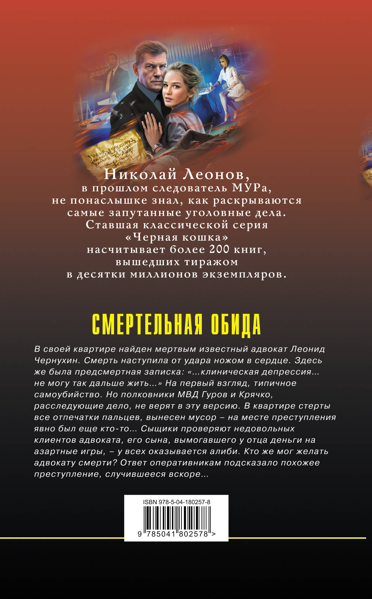 Еще одна книга легендарного тандема Леонов - Макеев. В своей квартире найден мертвым известный адвокат Леонид Чернухин. Смерть наступила от удара ножом в сердце. Здесь же была предсмертная записка: «…клиническая депрессия… не могу так дальше жить…». На первый взгляд, типичное самоубийство. Но полковники МВД Гуров и Крячко, расследующие дело, не верят в эту версию. В квартире стерты все отпечатки пальцев, вынесен мусор - на месте преступления явно был еще кто-то… Сыщики проверяют недовольных клиентов адвоката, его сына, вымогавшего у отца деньги на азартные игры, - у всех оказывается алиби. Кто же мог желать адвокату смерти? Ответ оперативникам подсказало похожее преступление, случившееся вскоре… Николай Леонов, в прошлом следователь МУРа, не понаслышке знал, как раскрываются самые запутанные уголовные дела. Поэтому каждая его книга - это правдивая захватывающая история с непредсказуемой интригой и неожиданным финалом. Главный герой этих книг, полковник Лев Гуров - сыщик высокого класса, к тому же с массой положительных человеческих качеств. Его уважают друзья, боятся враги и любят женщины. Он - настоящий отечественный супермен. Романы о Льве Гурове вот уже сорок лет неизменно привлекают поклонников отечественного детектива. Ставшая классической серия «Черная кошка» насчитывает более 200 книг, вышедших тиражом в десятки миллионов экземпляров.| Издательство | ООО "Издательство "Эксмо" |