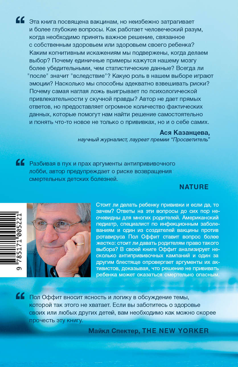 Пол Оффит, пожалуй, самый известный в мире педиатр, врач-иммунолог, специалист по инфекционным заболеваниям, один из создателей вакцины от ротавируса. Свою книгу «Смертельно опасный выбор» он посвящает одной из самых противоречивых тем современной педиатрии - прививкам. Вооружившись научно подтвержденными фактами и результатами новейших авторитетных исследований, Оффит развенчивает все основные заблуждения, связанные с вакцинацией, и опровергает ключевые постулаты самых громких антипрививочных кампаний. Приводя множество примеров как из истории медицины, так и из собственной практики, Оффит рассказывает, почему нужно бояться последствий самих заболеваний, а не побочных эффектов. Кроме того, вы узнаете, как и когда зародился страх перед прививками, как создавались новые вакцины и совершенствовались старые, как работают Центры по контролю и профилактике заболеваний, к чему может привести массовый отказ от прививок и почему возвращаются, казалось бы, давно забытые болезни. «Смертельно опасный выбор» - незаменимая книга как для молодых родителей, которые благодаря ей смогут отбросить в сторону ложные страхи, так и для тех, кто интересуется историей медицины и хочет быть в курсе ее последний достижений.| Издательство | Издательство "АСТ" |