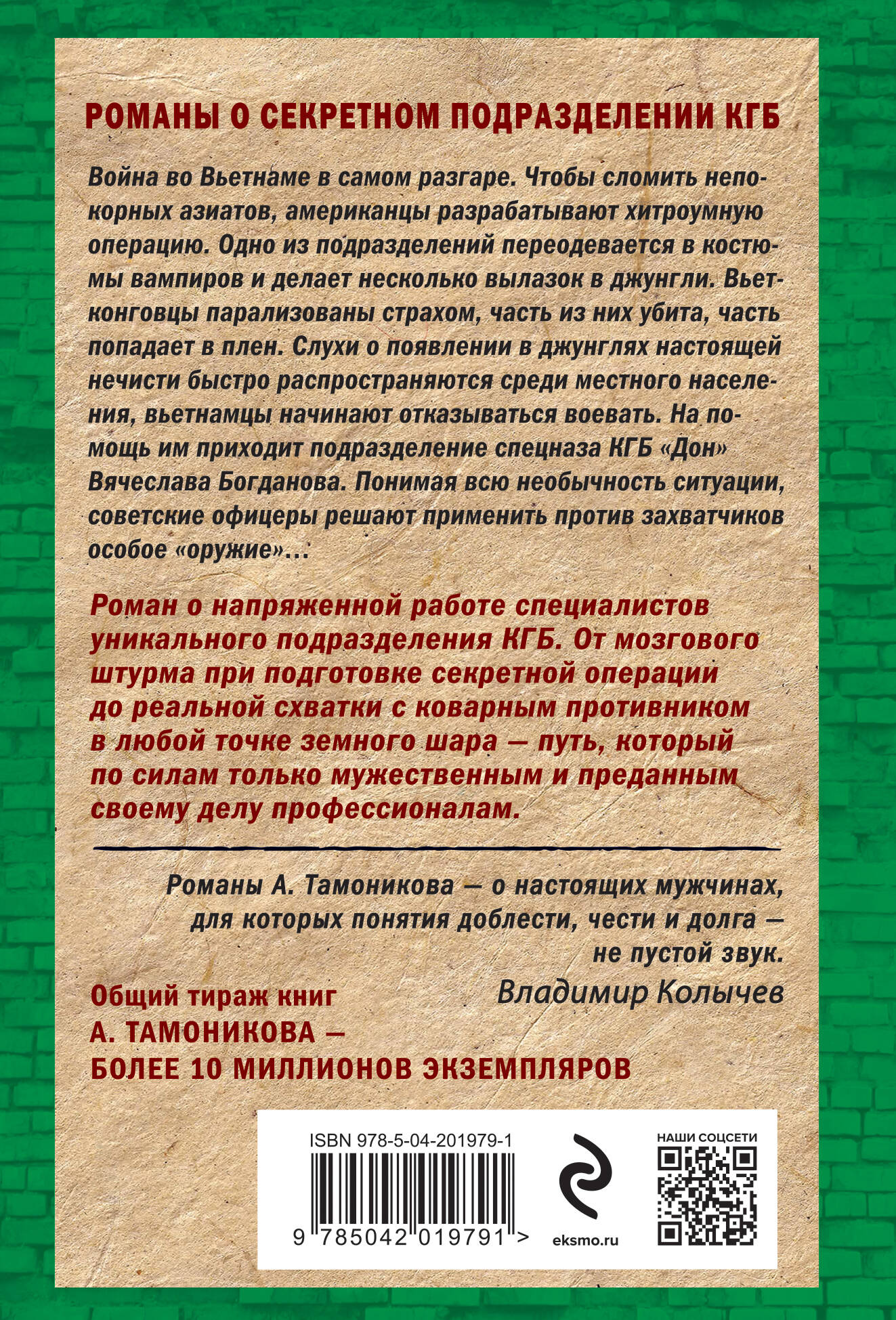 Роман о напряженной работе специалистов уникального подразделения КГБ. От мозгового штурма при подготовке секретной операции до реальной схватки с коварным противником в любой точке земного шара - путь, который по силам только мужественным и преданным своему делу профессионалам. Война во Вьетнаме в самом разгаре. Чтобы сломить непокорных азиатов, американцы разрабатывают хитроумную операцию. Одно из подразделений переодевается в костюмы вампиров и делает несколько вылазок в джунгли. Вьетконговцы парализованы страхом, часть из них убита, часть попадает в плен. Слухи о появлении в джунглях настоящей нечисти быстро распространяются среди местного населения, вьетнамцы начинают отказываться воевать. На помощь им приходит подразделение спецназа КГБ «Дон» Вячеслава Богданова. Понимая всю необычность ситуации, советские офицеры решают применить против захватчиков особое «оружие»… «Романы А. Тамоникова - о настоящих мужчинах, для которых понятия доблести, чести и долга - не пустой звук». - В. Колычев Общий тираж книг А. Тамоникова - более 10 миллионов экземпляров.