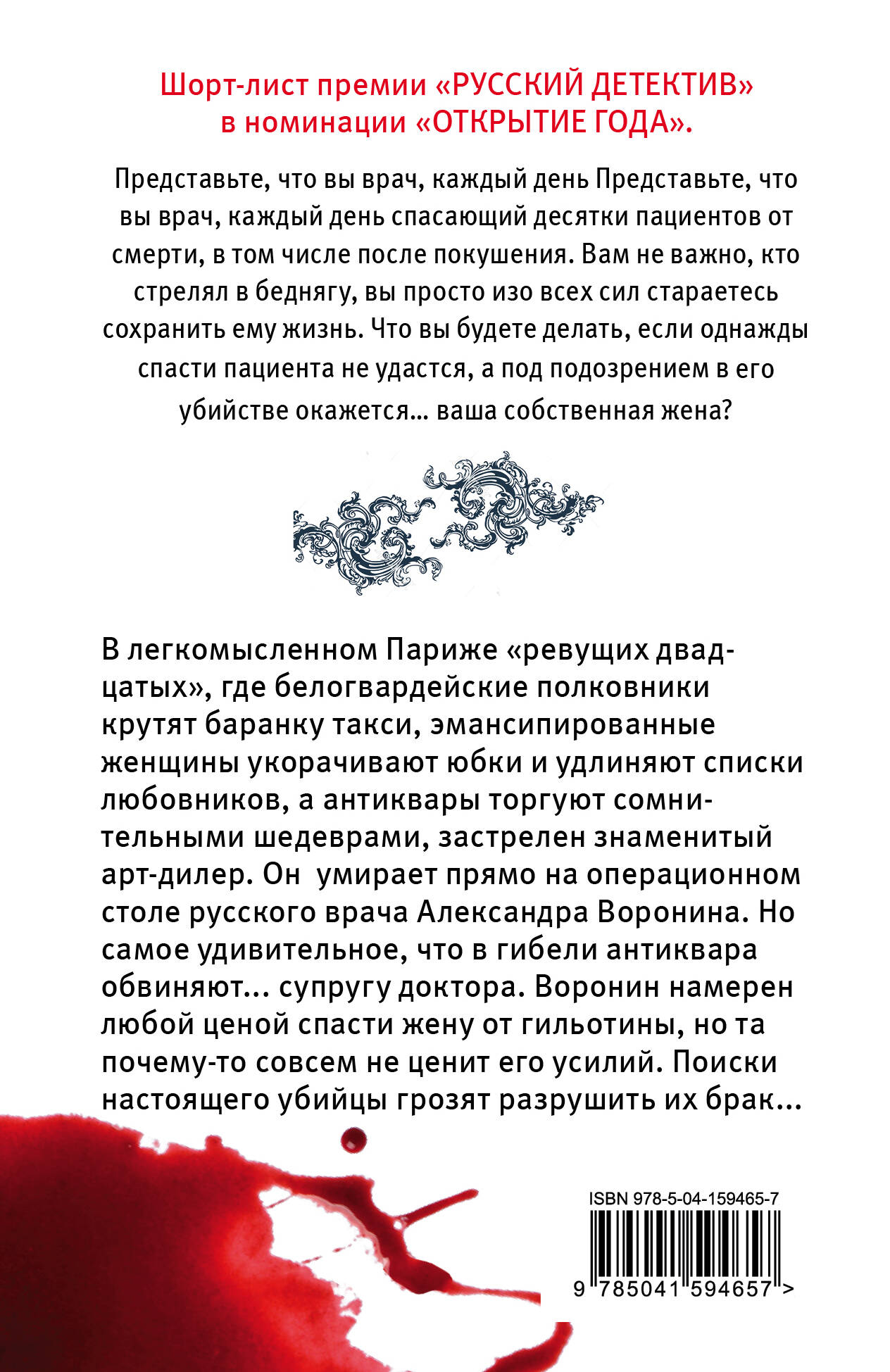 Шорт-лист премии «Русский детектив» в номинации «Открытие года». Представьте, что вы врач, каждый день спасающий десятки пациентов от смерти, в том числе после покушения. Вам не важно, кто стрелял в беднягу, вы просто изо всех сил стараетесь сохранить ему жизнь. Что вы будете делать, если однажды спасти пациента не удастся, а под подозрением в его убийстве окажется… ваша собственная жена? В легкомысленном Париже «ревущих двадцатых», где белогвардейские полковники крутят баранку такси, эмансипированные женщины укорачивают юбки и удлиняют списки любовников, а антиквары торгуют сомнительными шедеврами, застрелен знаменитый арт-дилер. Он умирает прямо на операционном столе русского врача Александра Воронина. Но самое удивительное, что в гибели антиквара обвиняют... супругу доктора. Воронин намерен любой ценой спасти жену от гильотины, но та почему-то совсем не ценит его усилий. Поиски настоящего убийцы грозят разрушить их брак...| Издательство | Эксмо |