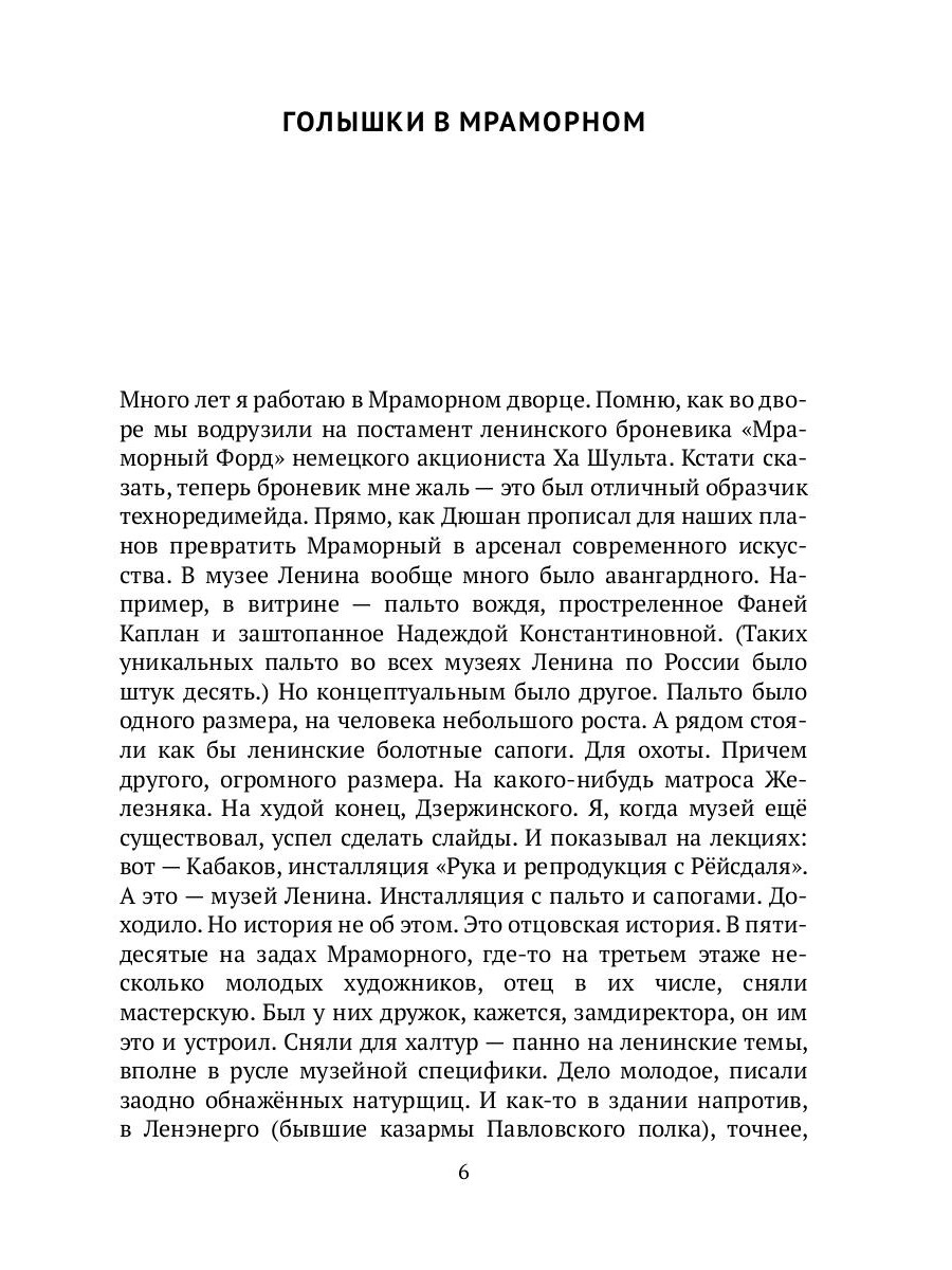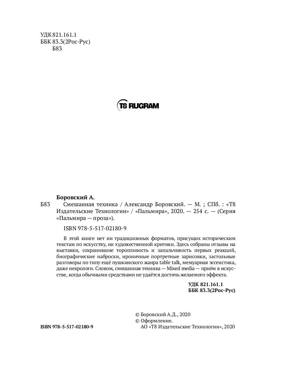 В этой книге нет ни традиционных форматов, присущих историческим текстам по искусству, ни художественной критики. Здесь собраны отзывы на выставки, сохранившие торопливость и запальчивость первых реакций, биографические наброски, ироничные портретные зарисовки, застольные разговоры по типу ещё пушкинского жанра table talk, мемуарная эссеистика, даже некрологи. Словом, смешанная техника - Mixed media - приём в искусстве, когда обычными средствами не удаётся достичь желаемого эффекта.| Издательство | Т8 RUGRAM |