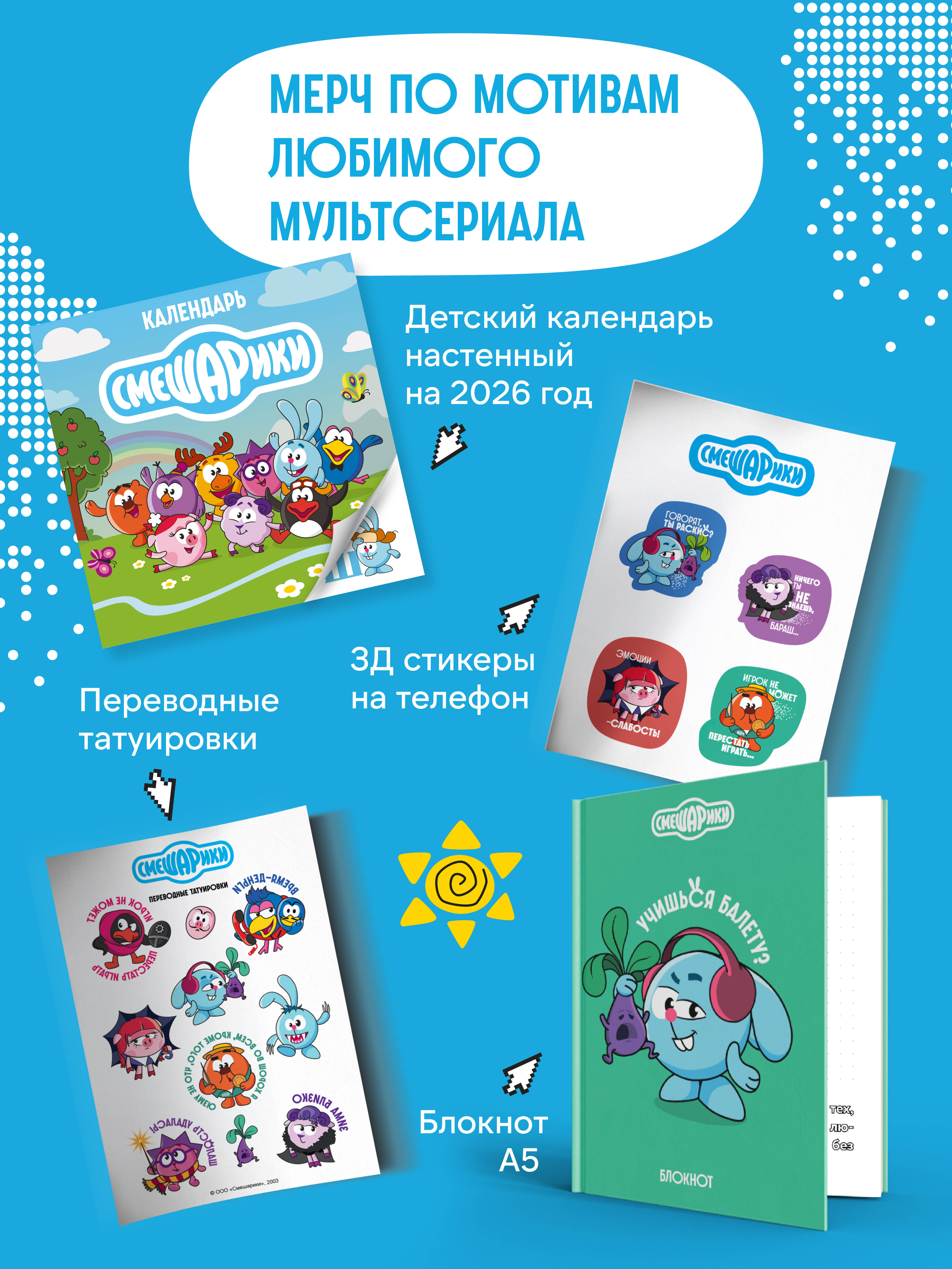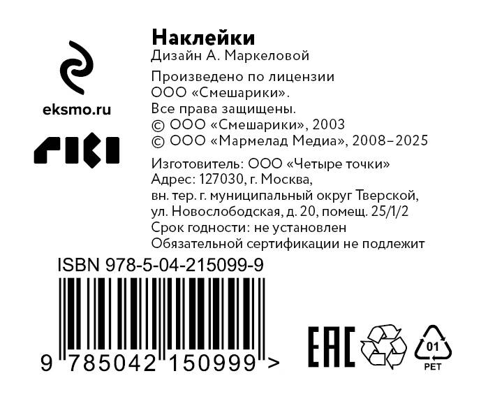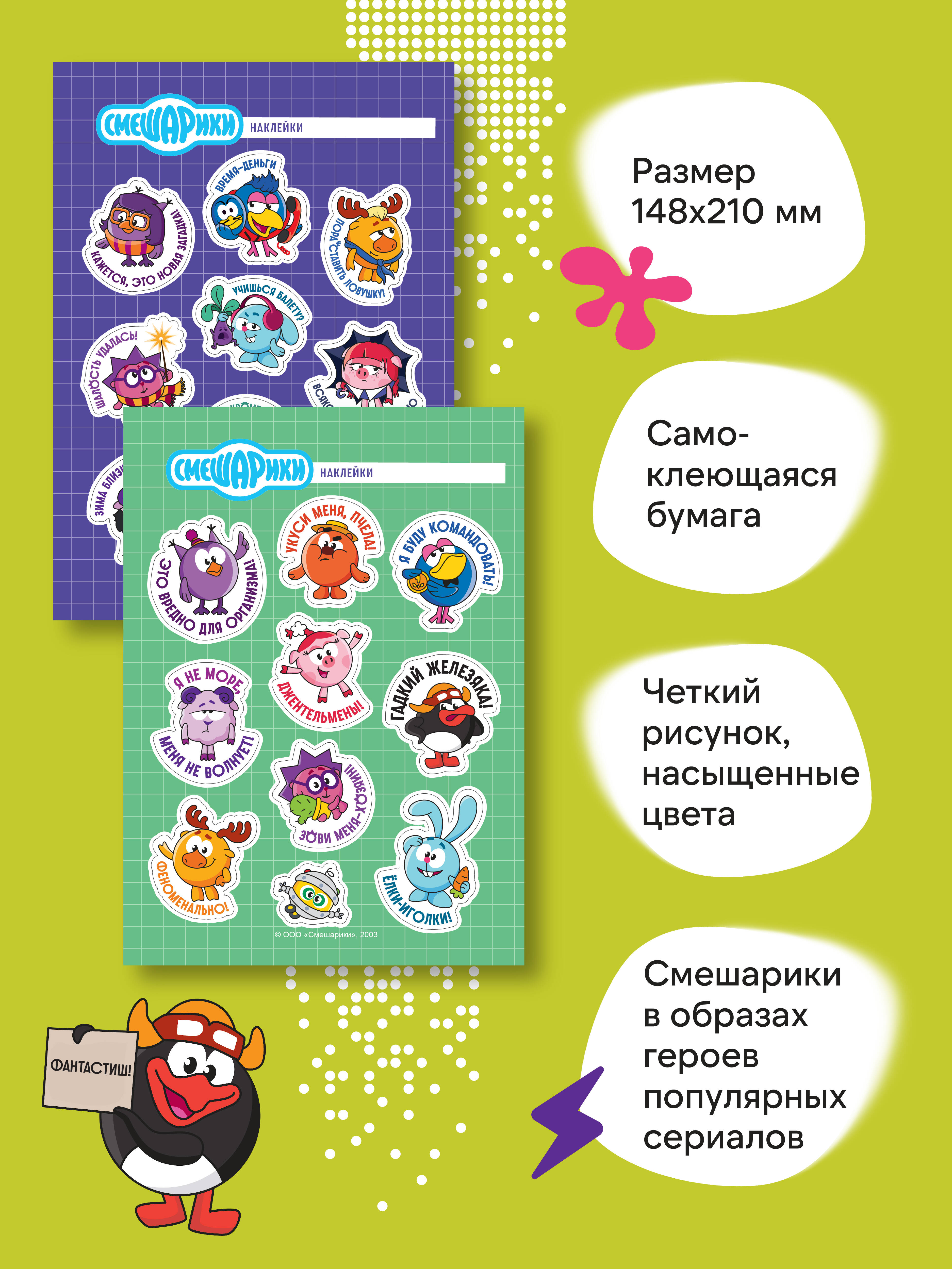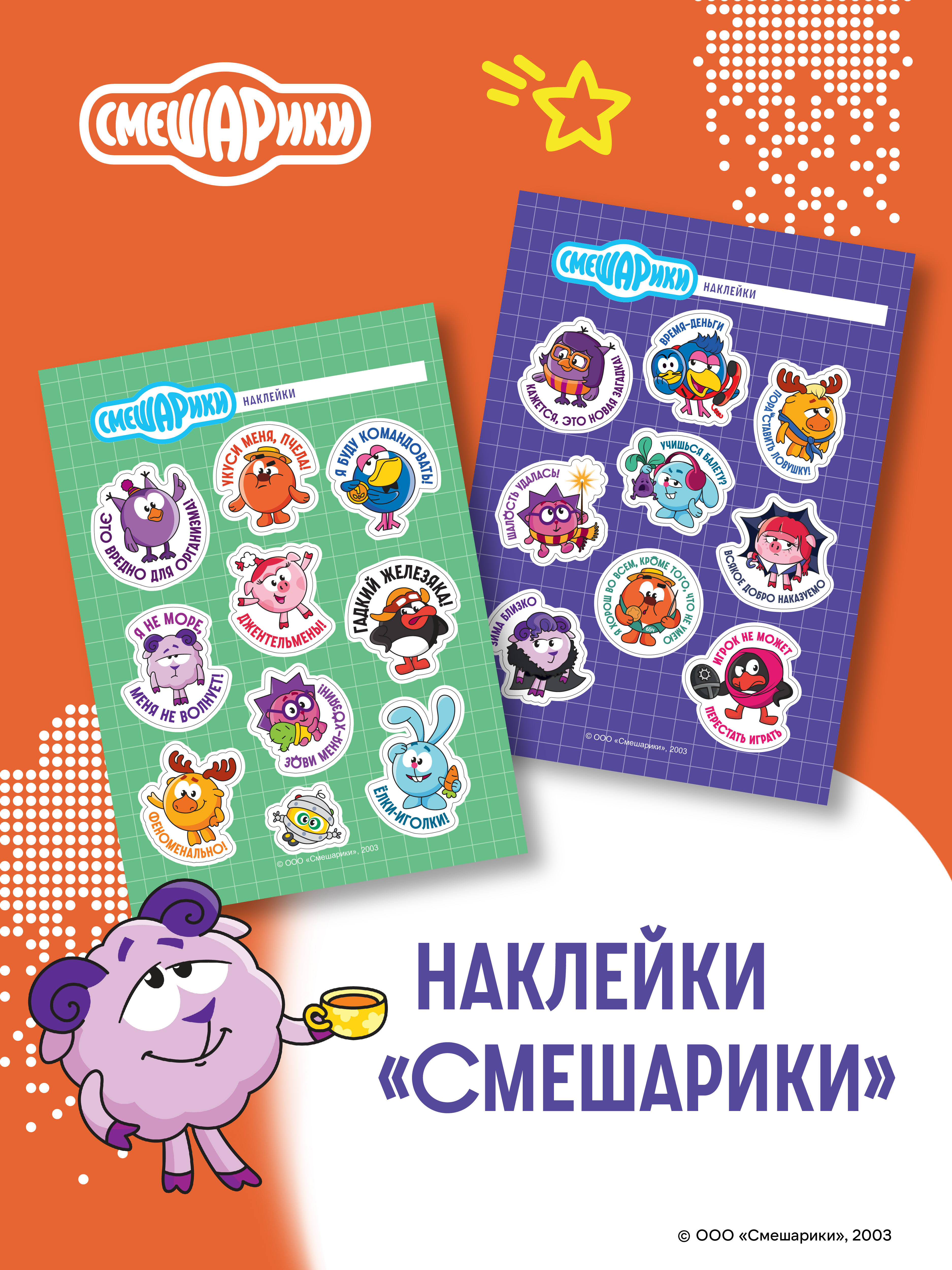 Побалуй своего внутреннего ребенка! «Укуси меня пчела!», «Зови меня "хозяин"», «Я не море… меня не волнует» - эти и другие цитаты зададут стиль вашей комнате, рабочему месту и планеру с дедлайнами. В наборе 2 листа с наклейками (всего 19 штук). На одном Смешарики в классическом своем великолепии. На втором Смешарики примерили на себя новые образы. Размер листа - А5 (148х210 мм). Наклейки не помнутся при доставке - мы положили в упаковку плотную картонку. Стикерпарк изготовлен из качественных материалов, благодаря чему наклейки долго не выцветут. Самоклеящаяся пленка не рвется, а наклейки легко отделяются от фона. Набор наклеек - это отличный подарок себе, а также сестрам, братьям и детям на Новый год или на день рождения. Собери всю коллекцию «Смешариков»: «Смешарики. 3D-стикеры на телефон» «Смешарики. Наклейки» (24 наклейки на 2 листах) «Смешарики. Переводные татуировки» «Смешарики. Блокнот шалость удалась!» (формат А5, 128 стр., с цитатами и картинками) Детский календарь настенный на 2026 год. «Смешарики» (290х290 мм)| Издательство | ООО "Издательство "Эксмо" |