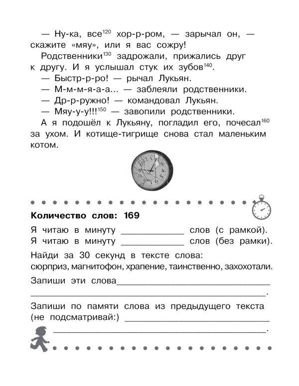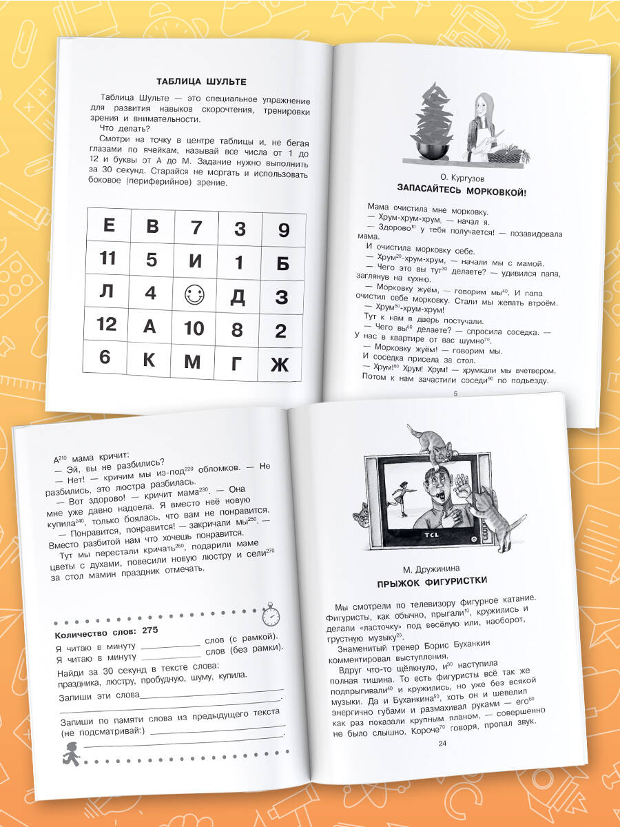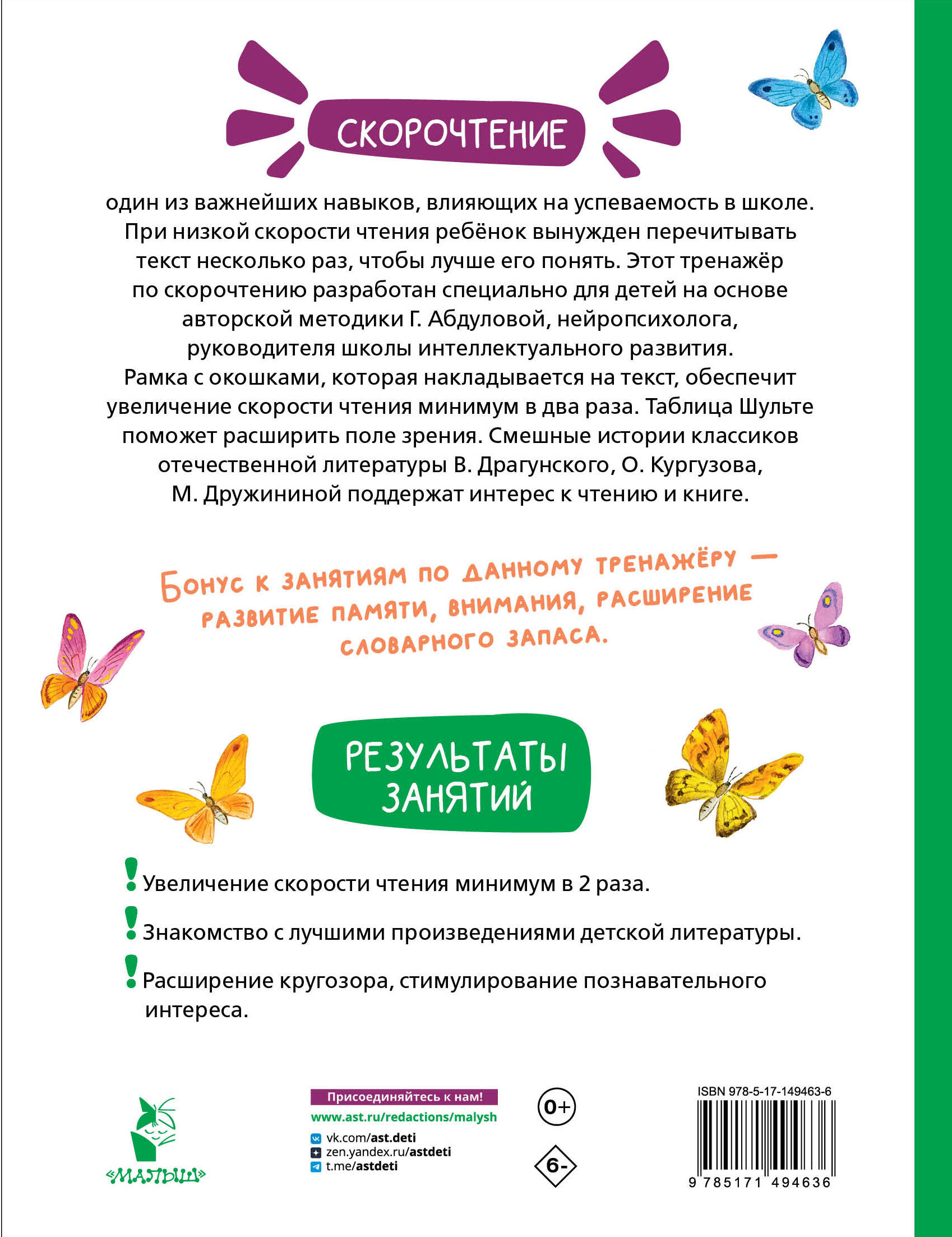 7 причин купить книгу: - Увеличение скорости чтения минимум в два раза. - Знакомство с лучшими произведениями детской литературы. - Развитие памяти, внимания, познавательного интереса, увеличение словарного запаса. - Таблица Шульте для расширения поля зрения. - Специальная рамка с окошками, которая накладывается на текст, и позволяет значительно улучшить технику чтения. - Занятия по авторской методике Г. Абдуловой, нейропсихолога, руководителя школы интеллектуального развития, - Тренировка одного из самых важных навыков для успешного обучения в школе.| Издательство | АСТ |
