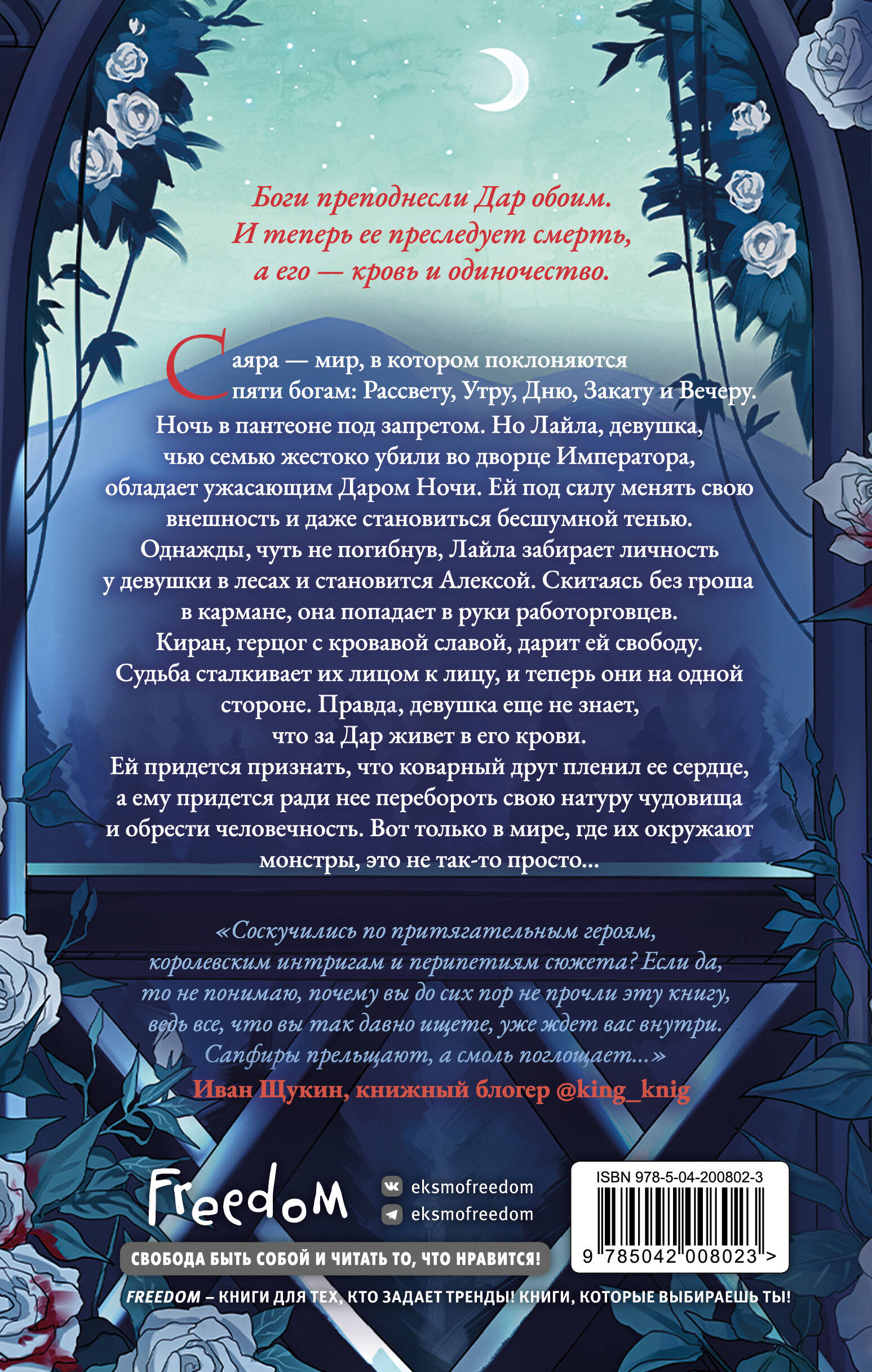 Потрясающая новинка от писательницы Тани Нордсвей, подарившей читателям цикл «Сталь и Коварство». Романтическое фэнтези о вампирах и ведьмах, фиктивных отношениях, дворцовых интригах, истинной любви и темных пророчествах. Идеально для поклонников циклов «Из крови и пепла» Дж. Арментроут, «Игры королей» Софи Анри, сериалов «Дневники вампира» и «Древние». Лайла - девушка с даром Ночи, запретной богини в Саяре. Киран - герцог, правая рука императора и ее спаситель, выкупивший свободу Лайлы три года назад на злосчастном аукционе. А еще он Ищейка, тот, кто не остановится, пока не найдет Одаренную. Запах ее крови сводит его с ума, но чувства к ней просто убивают. И теперь им обоим предстоит сделать выбор: любовь или смерть… Вас ждет: • Авторский мир Саяры, антураж кровавых и жестоких богов - Рассвета, Утра, Дня, Вечера и Заката, где шестая богиня Ночь в пантеоне под запретом. • Темные Дары, безжалостные Одаренные и привлекательный герцог, скрывающий свою мрачную тайну. • Водоворот интриг и прошлого. • Ведьмы, оборотни, истинная любовь, кровь, темные замки Средневековья.| Издательство | ООО "Издательство "Эксмо" |