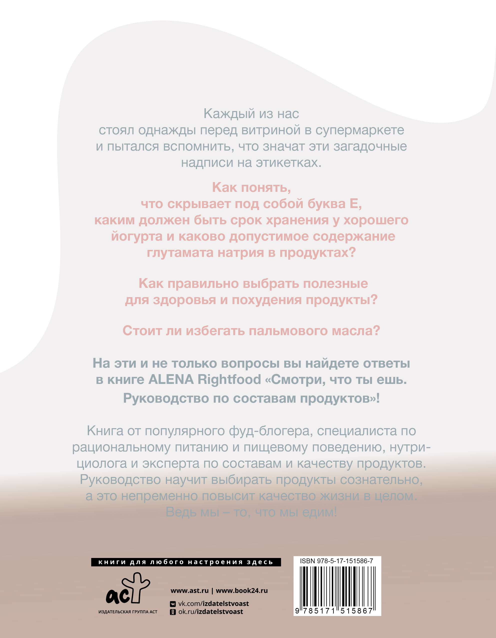 Каждый из нас стоял однажды перед витриной в супермаркете и пытался вспомнить, что значат эти загадочные надписи на этикетках. Как понять, что скрывает под собой буква E, каким должен быть срок хранения у хорошего йогурта и каково допустимое содержание глутамата натрия в продуктах? Как правильно выбрать полезные для здоровья и похудения продукты? Стоит ли избегать пальмового масла? На эти и не только вопросы вы найдете ответы в книге Alena Rightfood "Смотри, что ты ешь. Руководство по составам продуктов"! Книга от популярного фуд-блогера, специалиста по рациональному питанию и пищевому поведению, нутрициолога и эксперта по составам и качеству продуктов. Это руководство научит выбирать продукты сознательно, а это непременно повысит качество жизни в целом. Ведь мы - то, что мы едим!| Издательство | ИЗДАТЕЛЬСТВО "АСТ" |