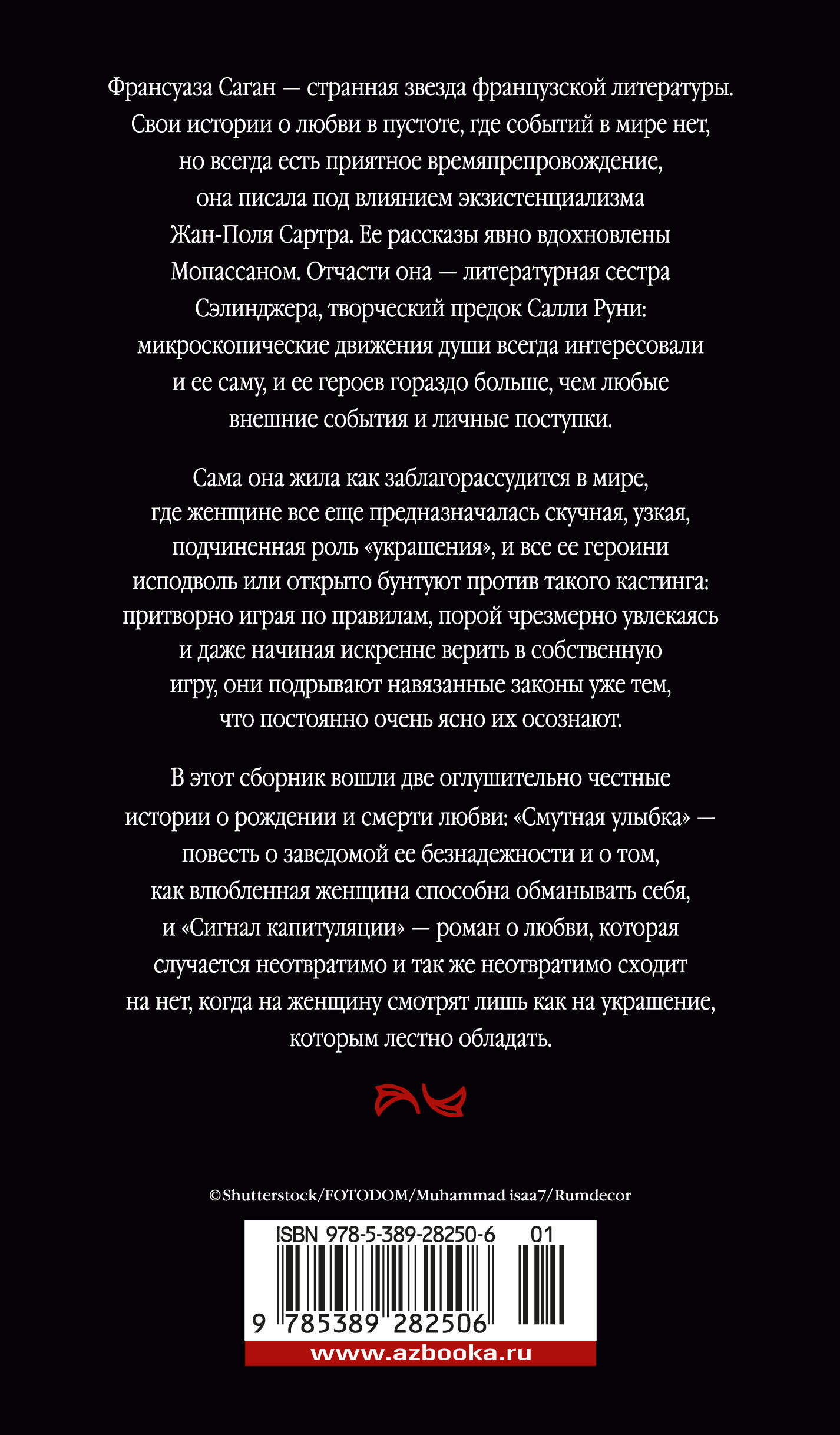 Франсуаза Саган - странная звезда французской литературы, неизменно современный классик вне любой современности. Свои истории о любви в пустоте, где событий в мире нет, но всегда есть приятное времяпрепровождение, она писала под влиянием экзистенциализма Жан-Поля Сартра. Ее рассказы явно вдохновлены Мопассаном. Отчасти она - литературная сестра Сэлинджера, творческий предок Салли Руни: микроскопические движения души всегда интересовали и ее саму, и ее героев гораздо больше, чем любые внешние события и личные поступки. И при этом в реальной жизни Саган находилось место и скандалам в светской хронике, и азартным играм, и бурной любви, и очень объемной реальности - например, парижским событиям 1968 года. Она жила как заблагорассудится в мире, где женщине все еще предназначалась скучная, узкая, подчиненная роль "украшения", и все ее героини исподволь или открыто бунтуют против такого кастинга: притворно играя по правилам, порой чрезмерно увлекаясь и даже начиная искренне верить в собственную игру, они подрывают навязанные законы уже тем, что постоянно очень ясно их осознают. В этот сборник вошли две оглушительно честные истории о рождении и смерти любви: "Смутная улыбка" - повесть о заведомой ее безнадежности и о том, как влюбленная женщина способна обманывать себя, и "Сигнал капитуляции" - роман о любви, которая случается неотвратимо и так же неотвратимо сходит на нет, когда на женщину смотрят лишь как на украшение, которым лестно обладать.