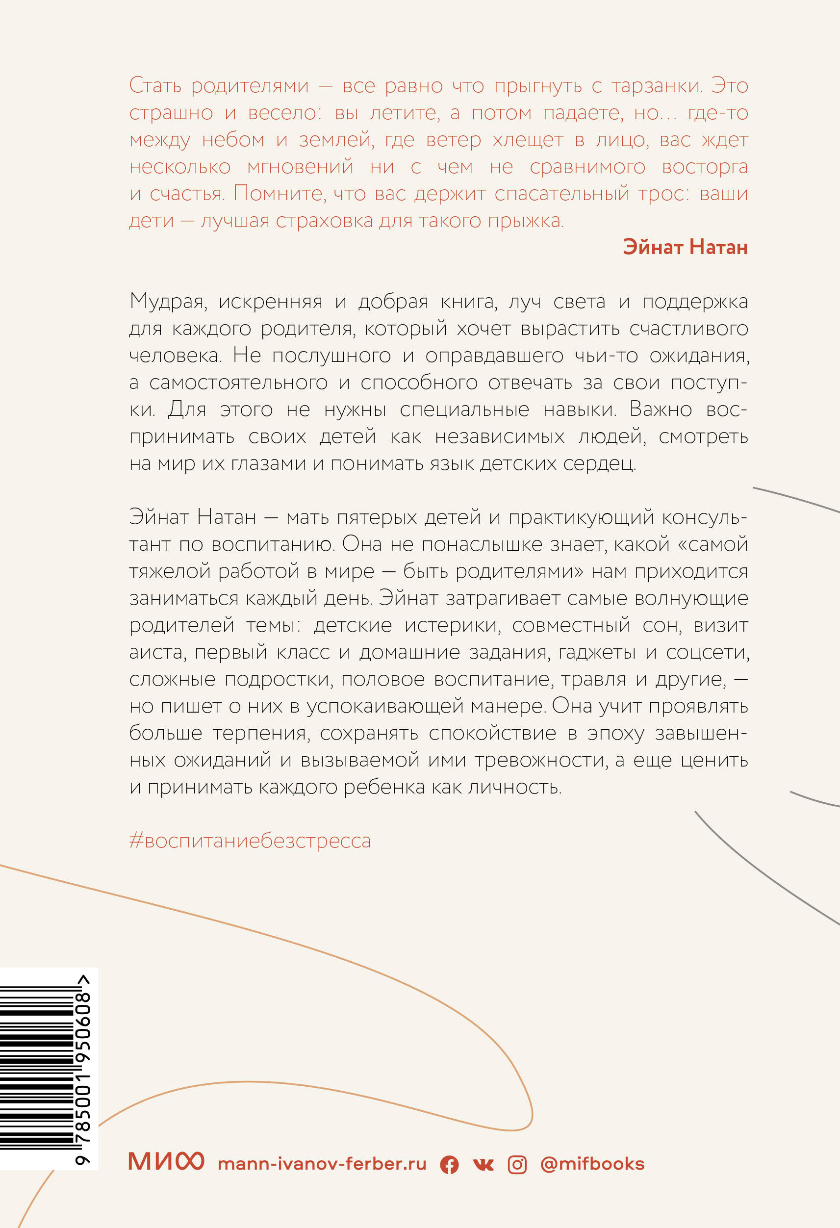 Бестселлер №1 в Израиле, книга показывает родителям, как научить детей быть сильными и независимыми, видя мир глазами своих детей и чувствуя его их сердцами. Мудрая, добрая и теплая книга, луч света и поддержка для каждого родителя, который видит свою основную задачу в том, чтобы вырастить счастливого человека. Не послушного, успешного и оправдавшего чьи-то ожидания, а самостоятельного, целеустремленного, способного отвечать за свои поступки. Для этого не нужны специальные навыки. Важно понимать детей, стараться смотреть на мир их глазами. Благодаря этой книге вы научитесь воспринимать своих детей как независимых людей, а не как продолжение вашей личности или собственную визитную карточку. Она поможет вам проявлять больше терпения, сохранить спокойствие в эпоху завышенных ожиданий и вызываемой ими тревожности, а еще ценить и принимать каждого ребенка как личность - с его причудами и недостатками. Эйнат Натан, мать пятерых детей и консультант по воспитанию в собственной клинике, затрагивает самые разные волнующие родителей темы: родительская тревога, детские истерики, совместный сон, гаджеты и соцсети, первый класс, домашние задания, половое воспитание, мертворождение, аутизм, травля и буллинг. Эта книга - не только руководство по воспитанию детей, но и исследование сложного эмоционального родительского пути. Оно напомнит вам о том, сколько мужества требует этот путь, о том, что ни один родитель не идеален. Фишки книги: Реальные истории из жизни мамы пятерых детей. Проблемы, знакомые каждому родителю. Не назидательный тон, а разговор на равных, как с подругой. Для кого книга: Для каждого родителя, который хочет помочь своему ребенку вырасти счастливым.| Издательство | МАНН, ИВАНОВ И ФЕРБЕР ООО |