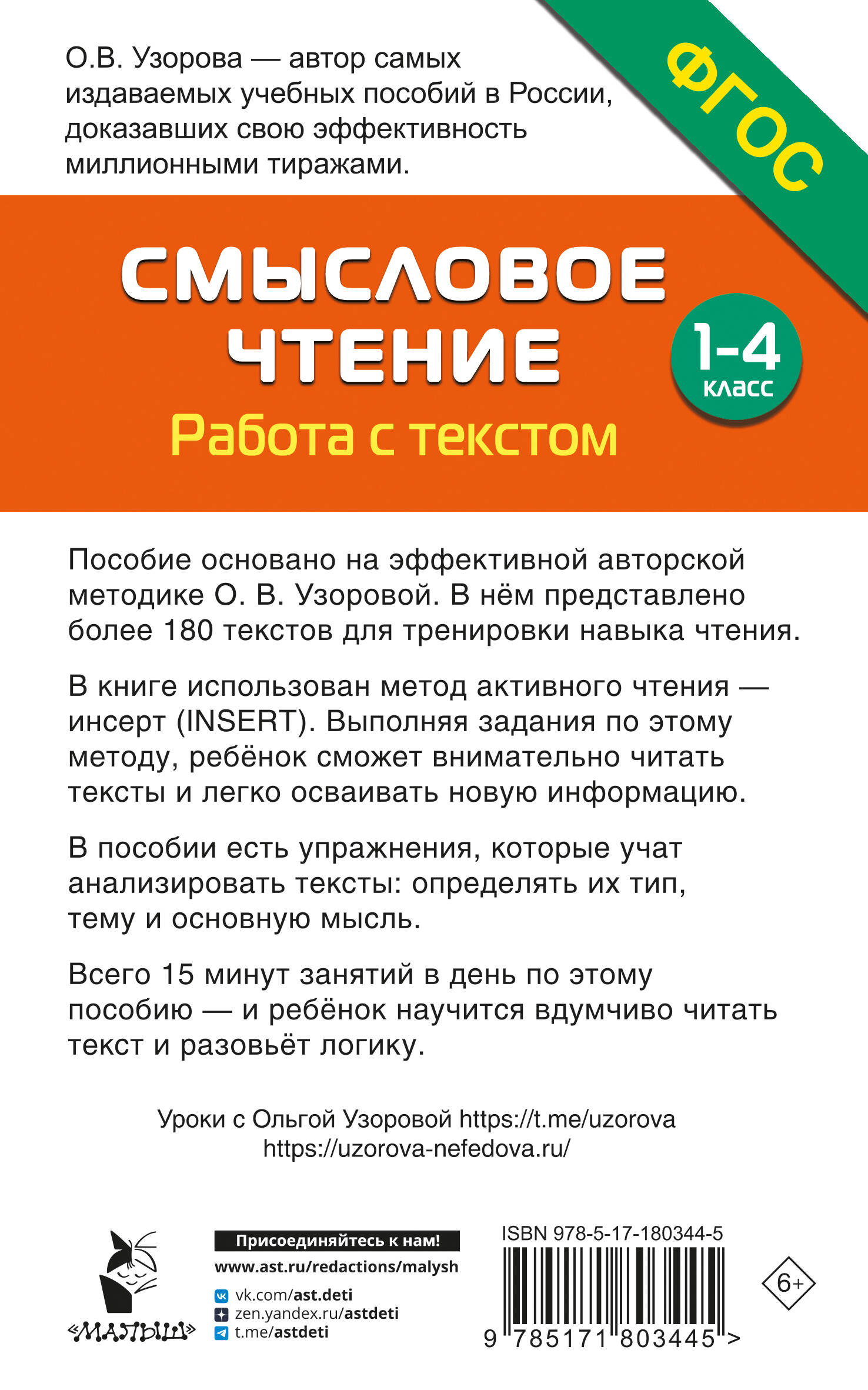 Как помочь ребёнку научиться вдумчиво читать текст? В этом вам поможет пособие «Смысловое чтение. Работа с текстом. 1-4 класс», основанное на эффективной авторской методике О. В. Узоровой. Занимаясь по книге, ребёнок потренирует технику чтения и научится работать с текстом: извлекать из него полезную для себя информацию, определять тему, главную мысль, тип текста. В пособии используется инсерт (INSERT) - эффективный метод развития критического мышления с помощью расстановки в тексте специальных пометок. Всего 15 минут занятий в день по этому пособию - и у ребёнка улучшится успеваемость по всем предметам, где нужно читать и анализировать.| Издательство | Издательство "АСТ" |