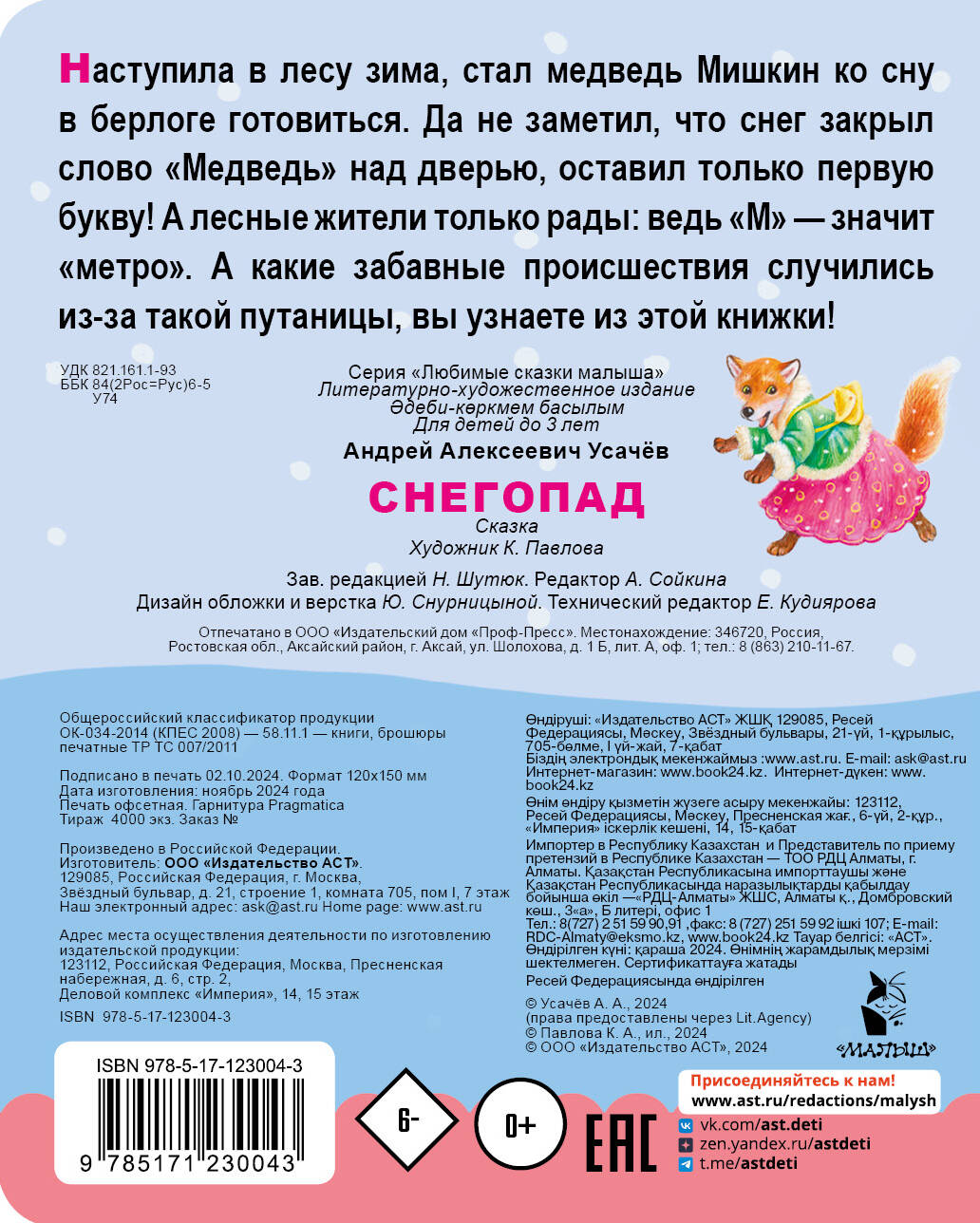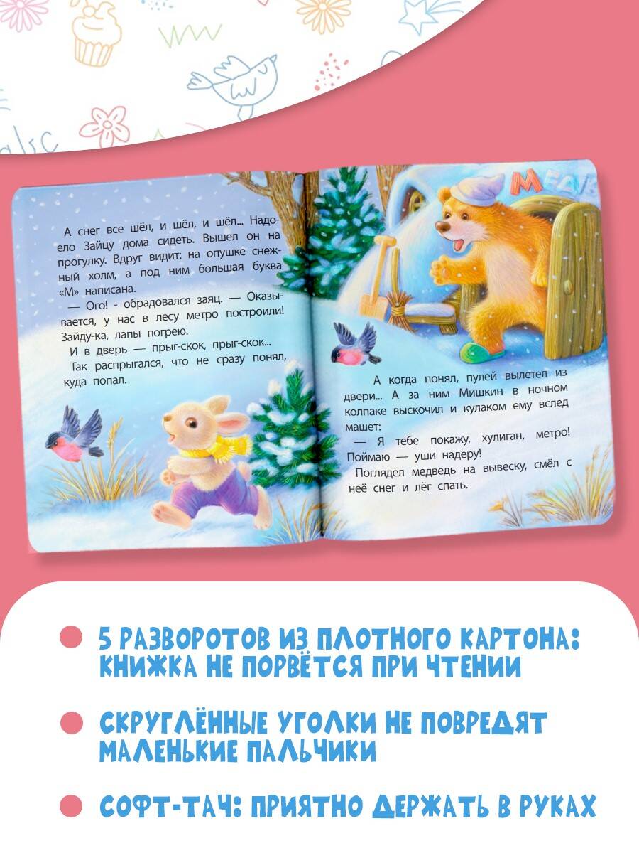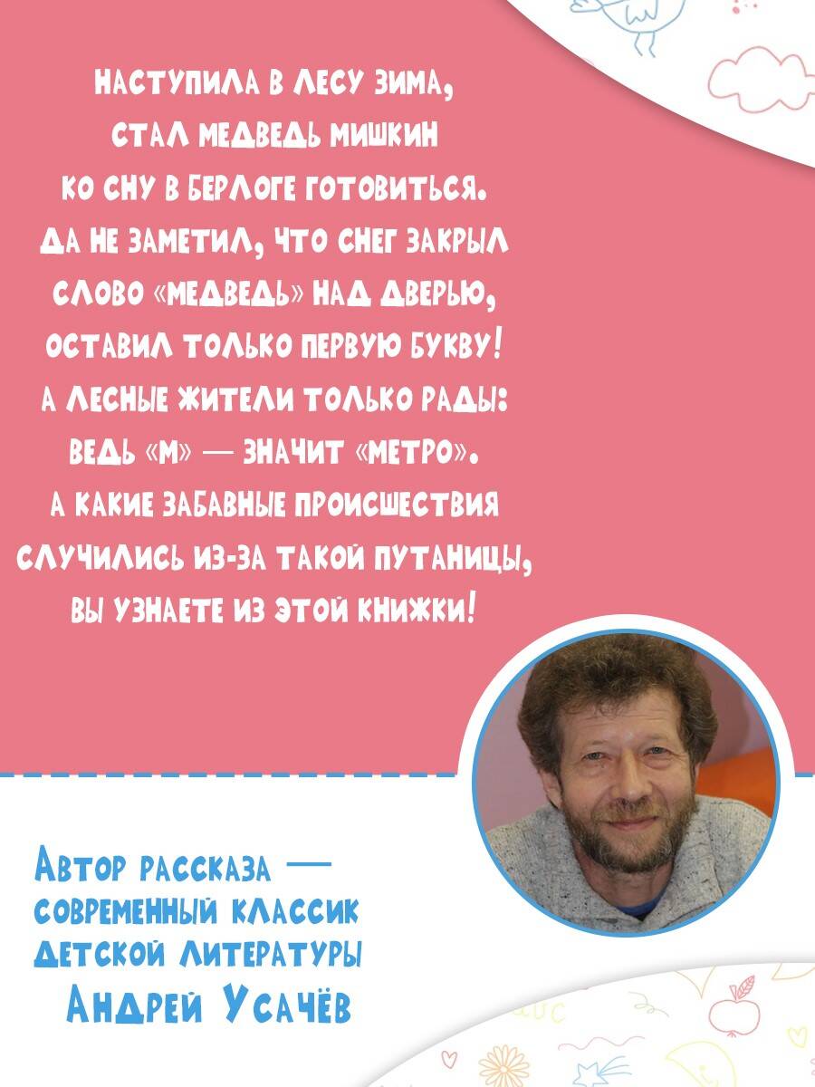 Наступила в лесу зима, стал медведь Мишкин ко сну в берлоге готовиться. Да не заметил, что снег закрыл слово "Медведь" над дверью, оставил только первую букву! А лесные жители только рады: ведь "М" - значит "метро". А какие забавные происшествия случились из-за такой путаницы, вы узнаете из этой книжки! Андрей Алексеевич Усачёв - классик отечественной детской литературы. Его сказки и стихи - весёлые, смешные и вместе с тем поучительные - очень нравятся и маленьким, и взрослым читателям. Эта книга предназначена именно для малышей: в ней яркие рисунки и крупные буквы, плотный картон не порвется при чтении, а скругленные уголки не повредят маленькие пальчики.| Издательство | Издательство "АСТ" |