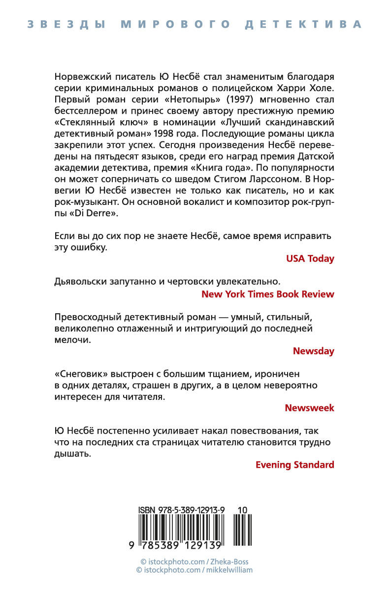 Поистине в первом снеге есть что-то колдовское. Он сводит любовников, заглушает звуки, удлиняет тени, скрывает следы. Разыскивая пропавшую Бирту Беккер, Харри Холе приходит к выводу, что годами в Норвегии в тот день, когда выпадает первый снег, бесследно исчезают замужние женщины. Впервые Харри сталкивается с серийным убийцей на своей родной земле. Преступник, которому газеты дали прозвище Снеговик, будто дразнит старшего инспектора, доводя его до последней грани безумия...| Издательство | Азбука-Аттикус Издат.группа ООО |