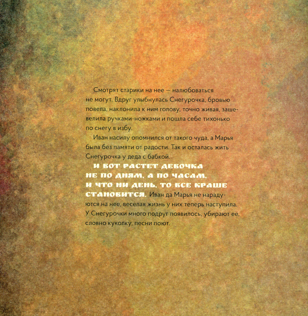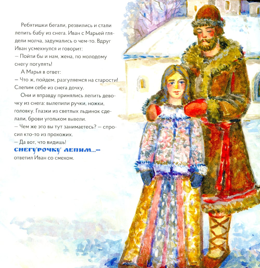 Создавая иллюстрации к сказке о девочке из снега (Снегурочка), мы вдохновлялись картинами Василия Сурикова, художника, чье творчество полнится образами и сюжетами из истории России, сценами народной жизни. Русская народная сказка о Снегурочке всегда занимала умы писателей, художников и композиторов - вспомнить хотя бы пьесу Островского или оперу Римского-Корсакова. Может, секрет в том, что в ней как нигде отразилась та самая загадочная душа, кроткая и непорочная? Создавая иллюстрации к сказке о девочке из снега, мы вдохновлялись картинами Василия Сурикова, художника, чье творчество полнится образами и сюжетами из истории России, сценами народной жизни. Сможете угадать, какая из иллюстраций повторяет композицию «Боярыни Морозовой», а какая - знаменитой картины «Меншиков в Березове»? Сравнивайте картинки из книги с оригиналами работ великого мастера, ищите общие детали и улавливайте различия, обсуждайте цветовую палитру и особенности эпохи. Для этого не нужно быть искусствоведом, достаточно увлечься сказкой и иллюстрациями. В конце книги можно прочитать об основных этапах творческого развития художника и узнать интересные факты о нем. Сюда же мы поместили репродукции оригинальных работ, которыми вдохновлялся наш иллюстратор.| Издательство | VoiceBook |