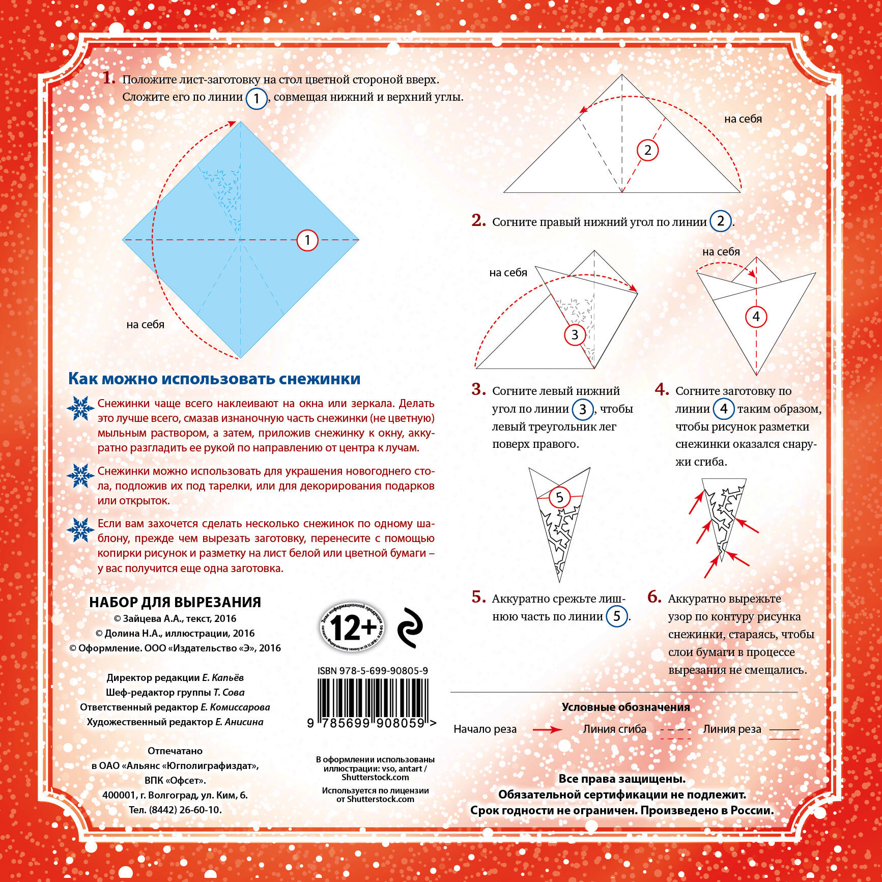Что внутри? В комплекте вы найдете десять цветных листов-заготовок с уже нанесенной разметкой контура для вырезания ажурных снежинок. Вам нужно всего лишь сложить лист-заготовку по приведенной на упаковке схеме и затем вырезать ножницами снежинку по линиям. Для кого и зачем: Для взрослых, детей, а также для взрослых детей - то есть для всех, кто верит в чудеса и с нетерпением ждет Нового года! Снежинками можно украсить окно, зеркало, елку, открытку, использовать для сервировки праздничного стола или в качестве дополнения к упаковке новогоднего подарка.| Издательство | ООО "Издательство "Эксмо" |