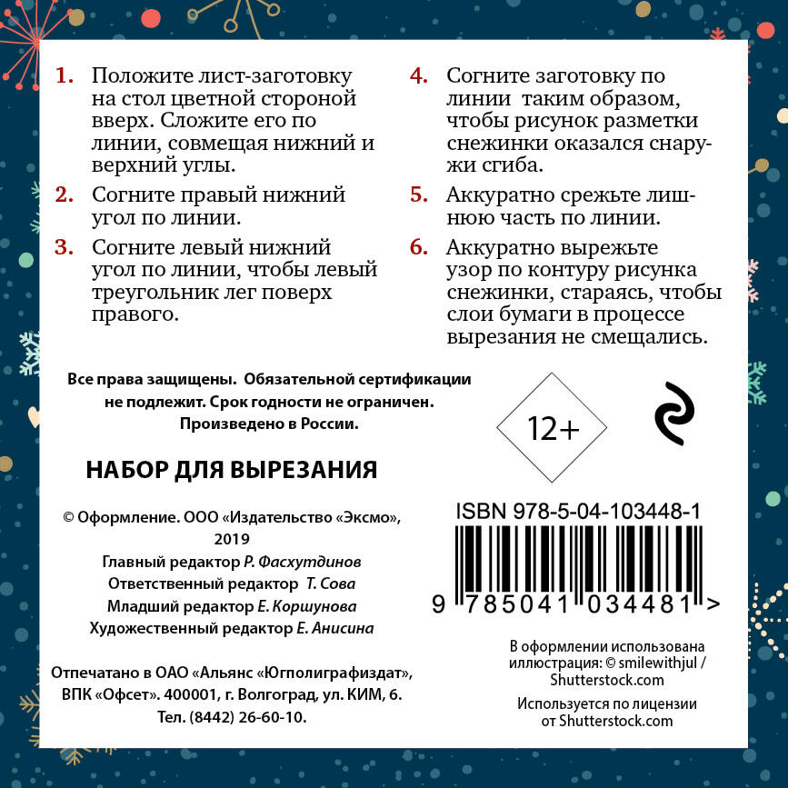 Пусть этот набор маленьких бумажных снежинок станет первым шагом в подготовке к Новому Году! Украсьте ими окно, зеркало, елку, открытку, используйте для сервировки праздничного стола или в качестве дополнения к упаковке новогоднего подарка. В комплекте вы найдете восемь цветных листов-заготовок с уже нанесенной разметкой контура для вырезания ажурных снежинок. Вам нужно всего лишь сложить лист-заготовку по приведенной на упаковке схеме и затем вырезать ножницами снежинку по линиям.| Издательство | ООО "Издательство "Эксмо" |