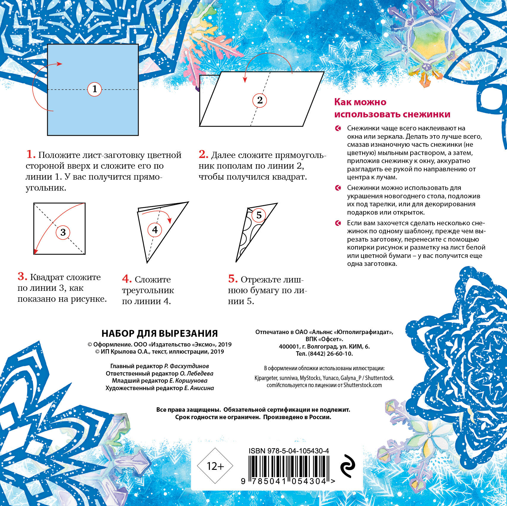 Набор удивительных воздушных снежинок поможет украсить свой дом, офис, школьный кабинет или игровую комнату в детском саду к Новому году! В одной книжечке - восемь цветных листов-заготовок с уже нанесенной разметкой контура для вырезания разных снежинок. Все, что вам нужно: сложить лист-заготовку по приведенной на обложке схеме и затем вырезать ножницами снежинку по линиям.| Издательство | ООО "Издательство "Эксмо" |